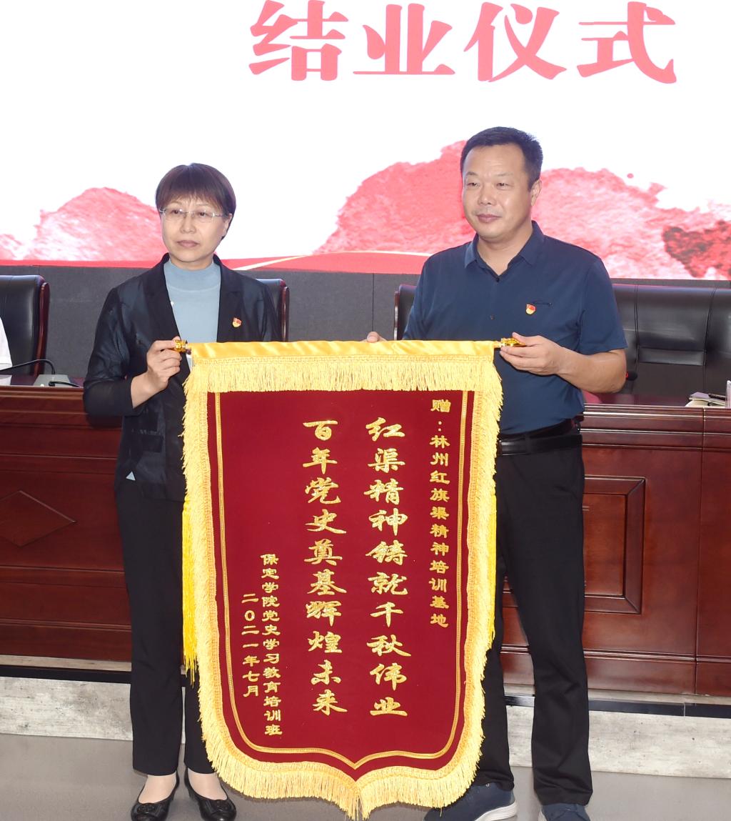 党委副书记、校长韩会玲在开班仪式上为培训班授旗,并在结业式上代表我校向红旗渠精神培训基地赠送了锦旗。
