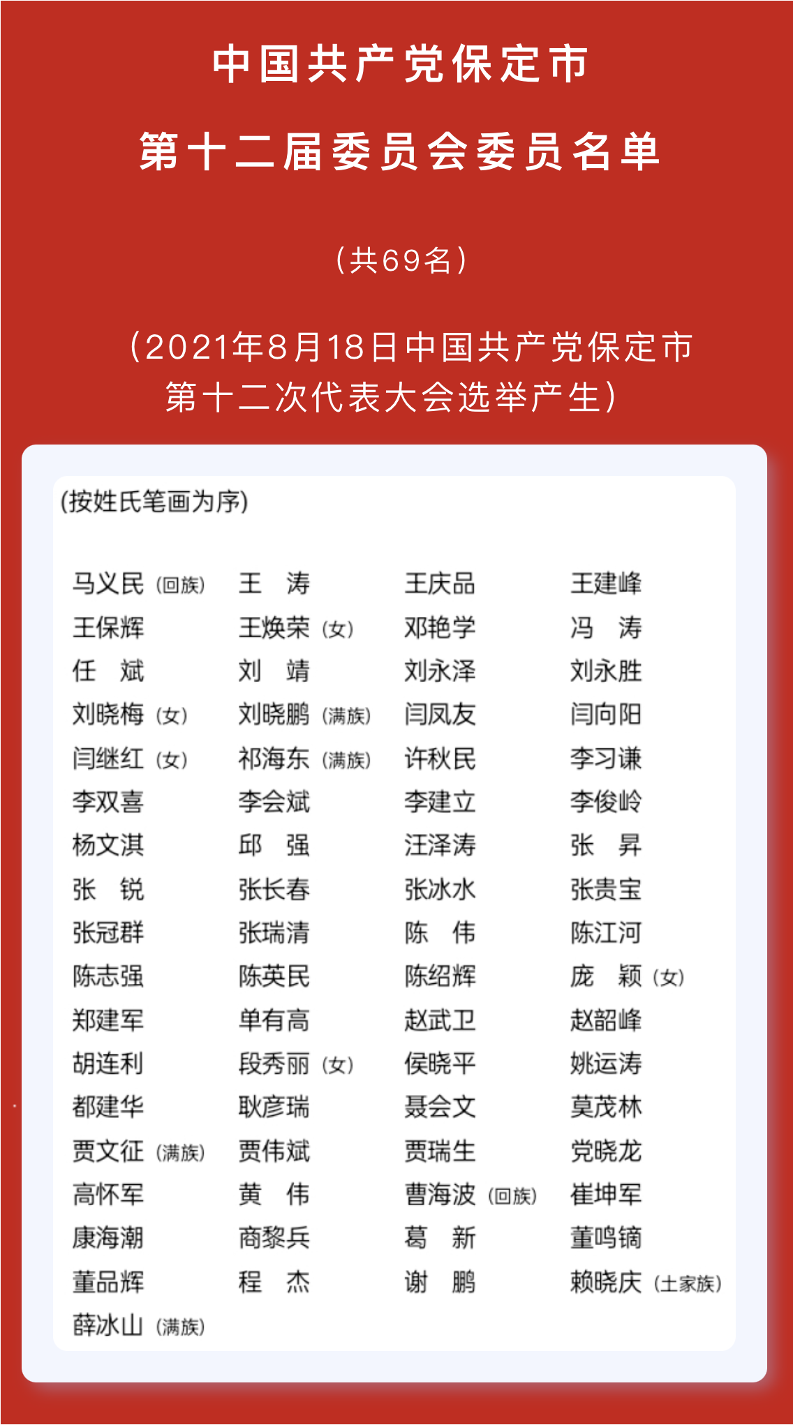 8月18日,中国共产党保定市第十二次代表大会选举产生了中国共产党保定市第十二届委员会委员69名,我校党委书记胡连利当选。
