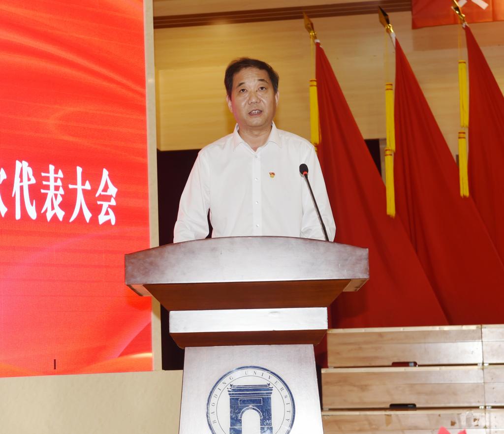 葛新代表共青团保定市委向大会的胜利召开表示祝贺,并寄语广大团员青年要打造市属院校团代会新标杆,打造继承发扬保定学院西部支教群体精神新标杆,打造“青春友好 青年参与”的城市参与新标杆,在建设现代化品质生活之城、青春友好城市的生动实践中创造更加辉煌的青春业绩。