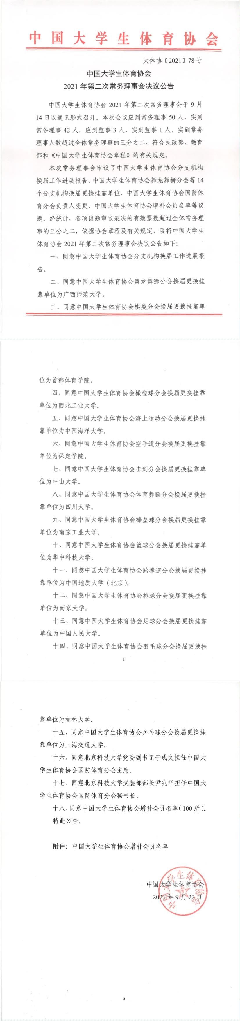 9月22日,中国大学生体育协会发布《2021年第二次常务理事会决议公告》,我校当选为中国大学生体育协会空手道分会挂靠单位。