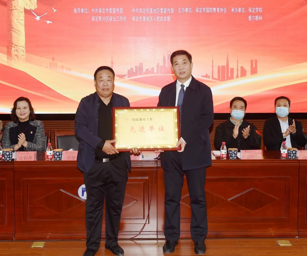 刘清波代表学校接受保定市国防教育协会会长高建章颁发的“国防教育工作先进单位”奖牌。