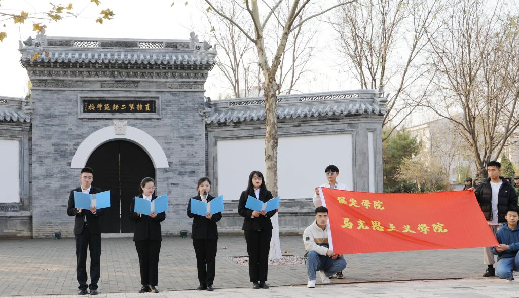 马克思主义学院学生在复建的直隶第二师范学校老校门前诵读红色经典
