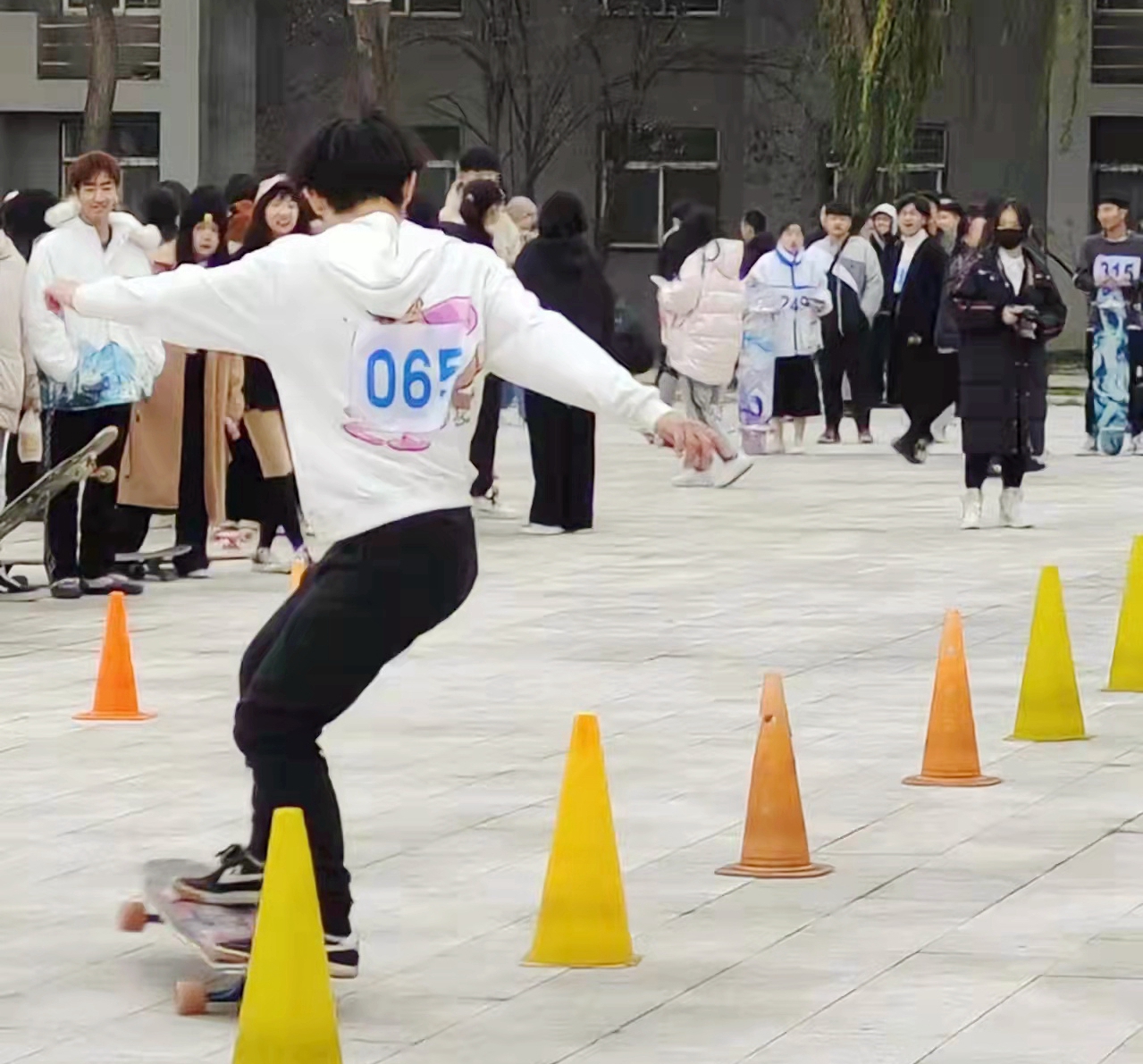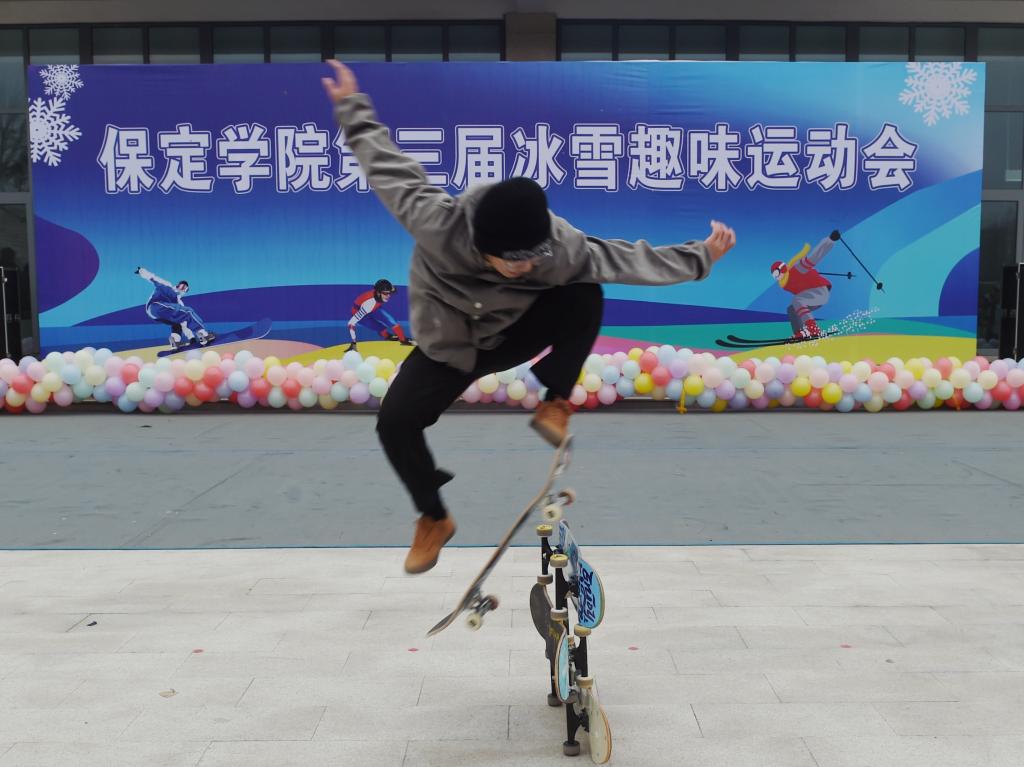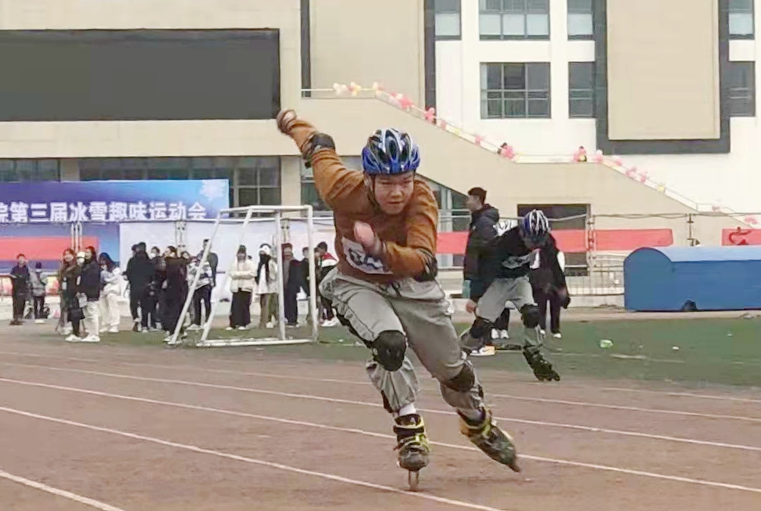 秉承“因地制宜、宜冰则冰、宜雪则雪、无冰雪则轮滑”的原则,本届运动会设立了轮滑、滑轮、滑板、冰壶等10个项目,共有1100人次参加比赛。师生们在轮滑接力赛、长板绕桩赛、趣味运动等赛事中顽强拼搏、携手奋进,给冬日的校园带来了尽显力与美、速度与激情的别样风景。