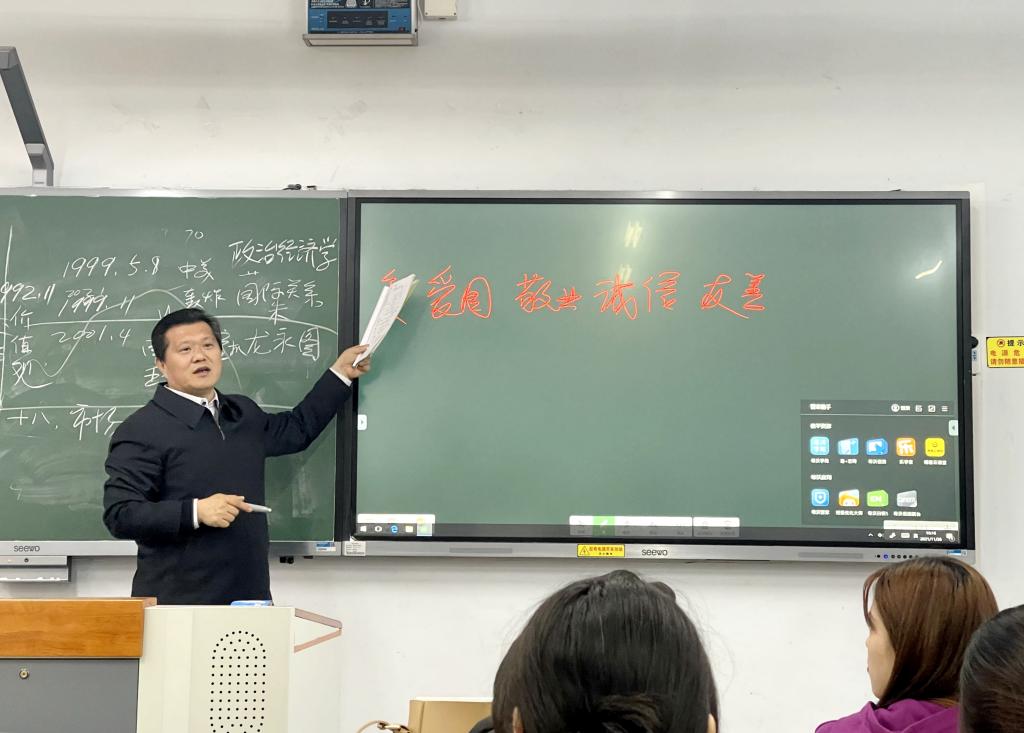 课上,赵其国从鸦片战争以来中国和世界的发展、2035年远景目标和2050年远景展望、中美关系及力量对比变化、思政专业学生应具有的素质、青年学生培育践行社会主义核心价值观的重要意义等方面进行了深刻阐述。他带领学生们回顾了近代以来中华民族的抗争史、奋斗史和党的百年发展历程,强调思政专业学生要做马克思主义的坚定信仰者,做习近平新时代中国特色社会主义思想的忠实践行者;要向西部支教毕业生群体学习,服务人民,奉献祖国;要提升专业素养,学会用大白话讲大道理,将理论与实践紧密结合;要将社会主义核心价值观融入学习生活各方面,为实现中华民族伟大复兴的中国梦努力奋斗,勇毅前行。