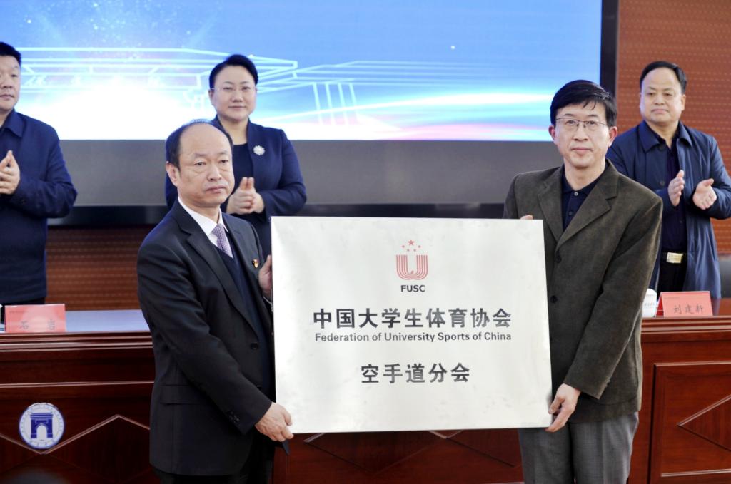 李兵代表中国大学生体育协会向我校授牌,胡连利代表我校接受“中国大学生体育协会空手道分会”牌匾。