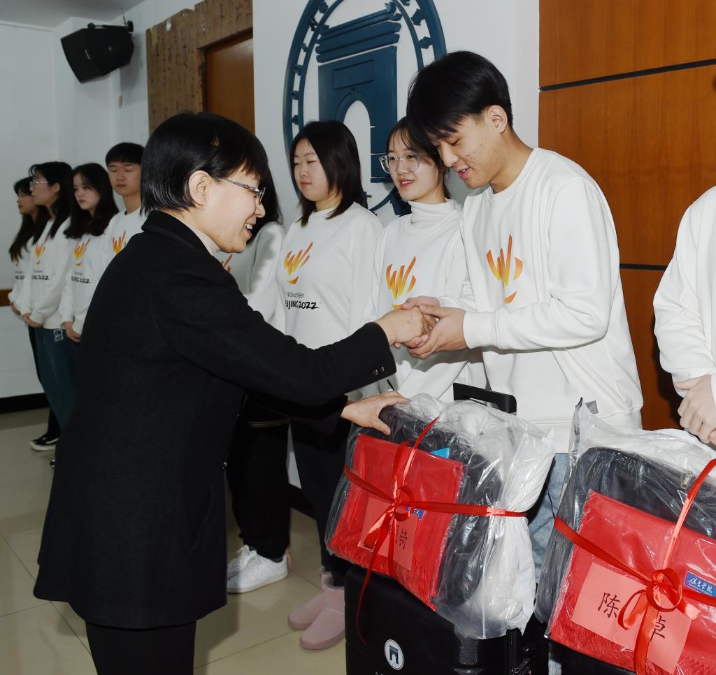 党委副书记、校长韩会玲为出征冬奥会的志愿服务团队授旗。