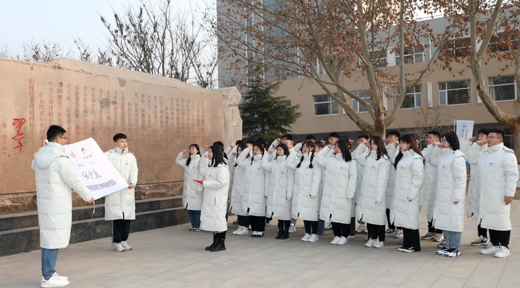 “志愿青春,冬奥有我!”全体志愿者在回信石前庄严宣誓,表达出服务好冬奥的坚定决心。8日清晨,31名志愿者从回信石广场出发,踏上服务冬奥会的征程,奔赴张家口山地转播中心开展服务工作。