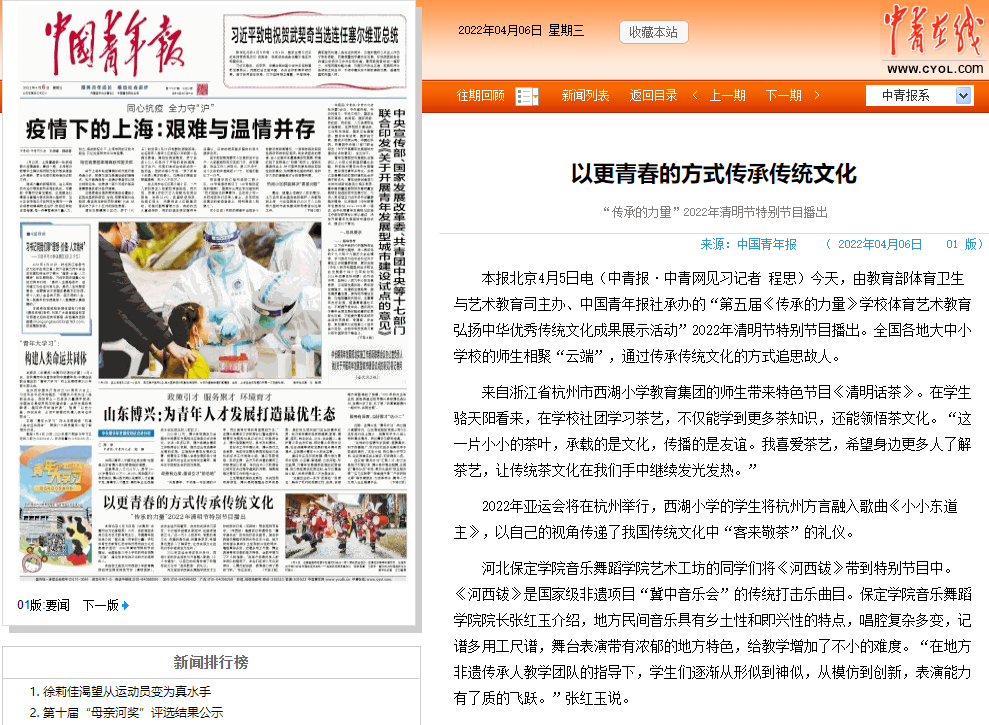 4月6日,《中国青年报》在头版重要位置用《以更青春的方式传承传统文化》为题刊登了对该节目的专题报道,文中详细介绍了我校在美育中注重传承传统文化的教学实践。