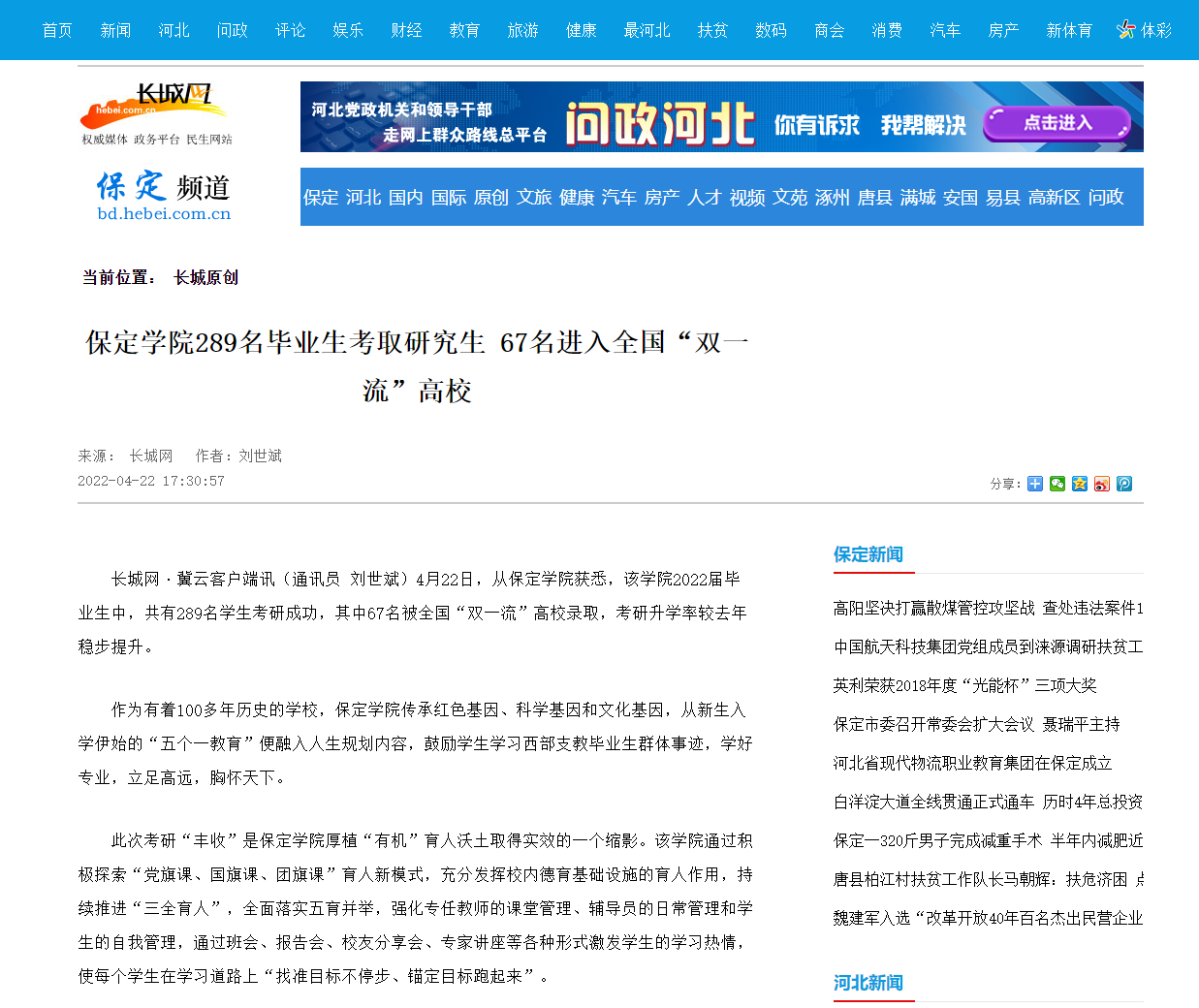 今年,我校2022届毕业生考研工作取得优异成绩,实现了报考人数、上线人数和“双一流”录取人数的稳步提升,受到媒体的广泛关注。4月22日,长城网·冀云客户端以《保定学院289名毕业生考取研究生 67名进入全国“双一流”高校》为题,对我校本科生考研、学风建设工作作了详细报道。