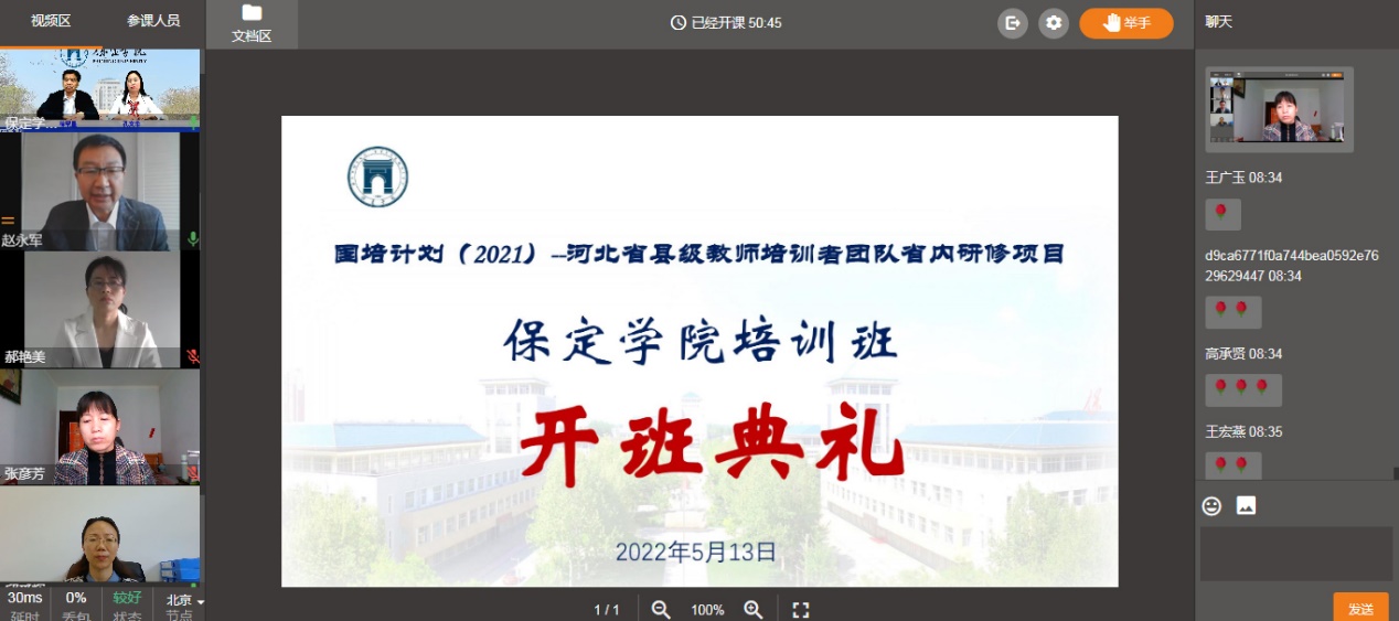 5月13日上午,“国培计划(2021)”河北省县级教师培训者团队省内研修项目保定学院培训班开班典礼在线上举行。河北省中小学教师继续教育中心副主任邱爱辉,我校党委常委、副校长徐景星,继续教育学院负责同志、培训项目管理服务团队教师和来自我省各地(市)教师发展中心、中小学的300名学员参加典礼。