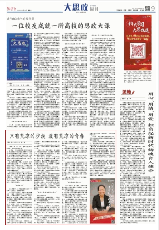 5月24日,《中国青年报》第9版“大思政周刊”以《只有荒凉的沙漠 没有荒凉的青春》为题,刊发“百年团史精神路标”系列我校西部支教毕业生群体专题报道。报道用近三千字的篇幅深情讲述了以侯朝茹为代表的我校西部支教毕业生二十二年扎根边疆,让青春绽放在服务人民、奉献祖国的坚定选择中的感人事迹。
