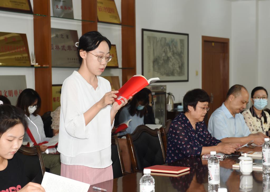 在读书分享环节,马克思主义学院教师楚颖慧、文学院学生刘筱莉、外语教育与国际商务学院学生徐艺丹饱含深情诵读了《让群众过上好日子——习近平正定足迹》的部分内容并谈了学习体会。大家纷纷表示,阅读学习这本生动鲜活的著作,深刻感悟习近平总书记真挚的为民情怀,使我们更加牢固树立以人民为中心的发展思想,我们一定会以奋斗的姿态追寻习近平总书记的足迹,坚定不移听党话,矢志不渝跟党走,以实际行动迎接党的二十大胜利召开。