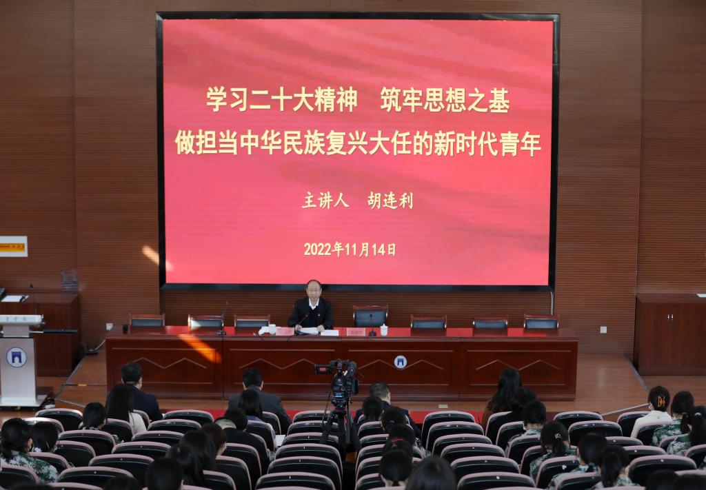 胡连利以《学习二十大精神 筑牢思想之基 做担当中华民族复兴大任的新时代青年》为题,从党的二十大所取得的主要成果和重大意义、过去五年的工作和新时代十年的伟大变革、开辟马克思主义中国化时代化新境界、中国式现代化的中国特色和本质要求、全面建设社会主义现代化国家的目标任务和战略部署、坚持和加强党的全面领导和全面从严治党、以顽强斗争应对风险挑战等七个方面作了系统宣讲和深入阐释。