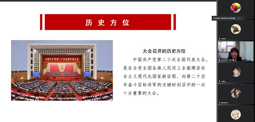 为深入学习宣传贯彻党的二十大精神,切实把全校师生的思想统一到党的二十大精神上来,把智慧和力量凝聚到党的二十大确定的各项任务上来,按照中央和省委统一部署,11月23日下午,省委“走基层”进校园宣讲分团成员、河北农业大学马克思主义学院副院长李文静,为我校师生作党的二十大精神宣讲报告。