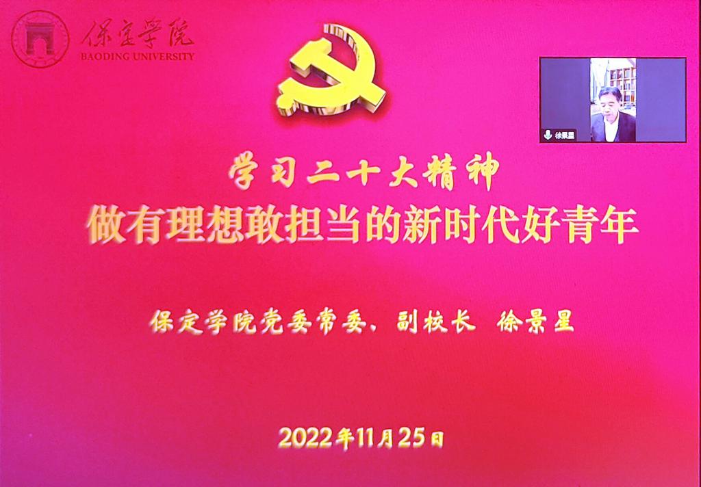 徐景星以《学习二十大精神 做有理想敢担当的新时代好青年》为题,围绕党的二十大的主题、主要成果、过去5年的工作和新时代10年的伟大变革、马克思主义中国化时代化、中国式现代化、全面建设社会主义现代化国家的目标任务、坚持党的全面领导和全面从严治党、应对风险挑战等内容,系统深入解读了党的二十大精神。