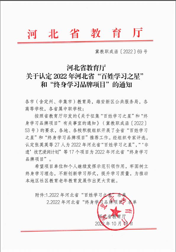 “百姓学习之星”的评选,旨在弘扬全民终身学习的理念,宣传全民终身学习的先进事迹,促进学习型社会建设,为推动本地区社区教育发展作出更大贡献。此次,经过专家评选,全省共有27人被认定为2022年河北省“百姓学习之星”,其中,保定市3人入选。
