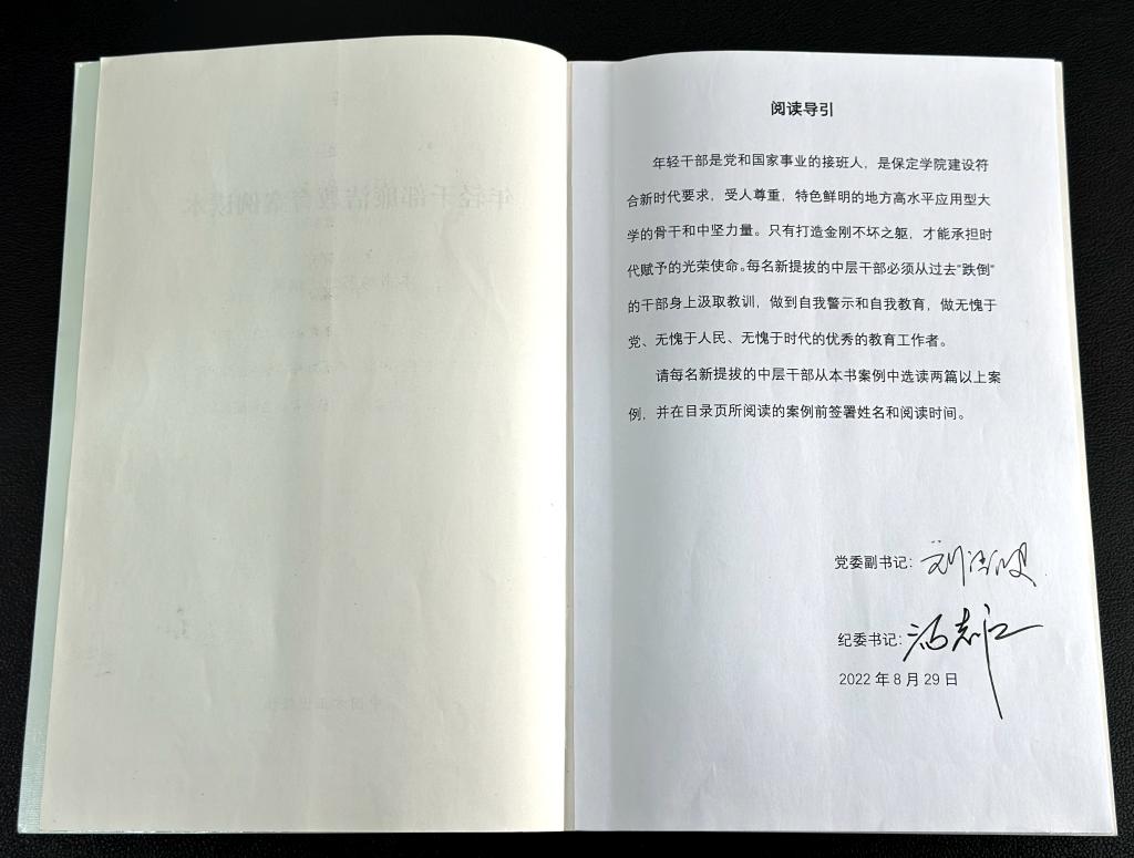 2022-2023年秋季学期,党委副书记刘清波,党委常委、纪委书记、监察专员汤志江向新提任中层领导干部发出倡议,开展“共读一本书——《年轻干部廉洁教育案例读本》”活动。