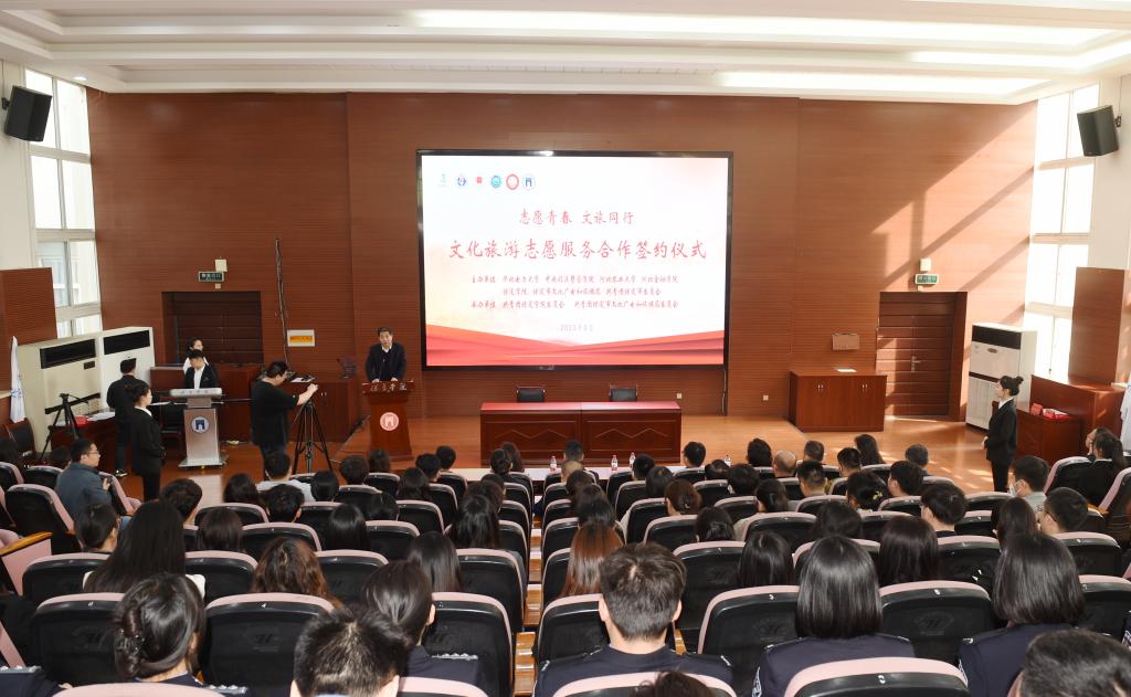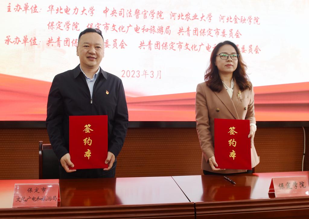 与会人员观看了宣传片《和美保定》。保定市文化广电和旅游局分别与华北电力大学、中央司法警官学院、河北农业大学、河北金融学院和我校签订文化旅游志愿服务合作意向书。