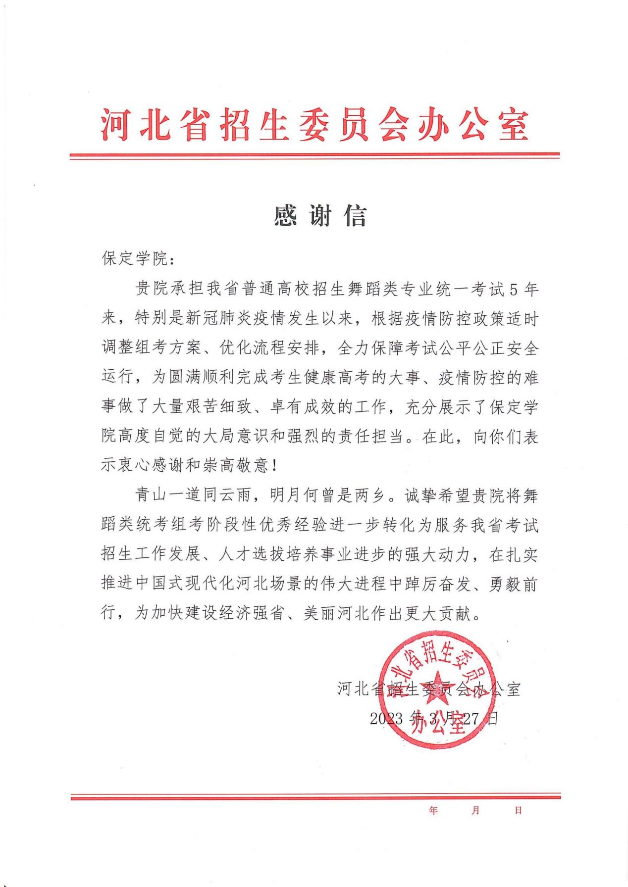 信中指出,保定学院承担河北省高校招生舞蹈类专业统一考试5年来,特别是新冠肺炎疫情发生以来,根据疫情防控政策适时调整组考方案、优化流程安排,全力保障考试公平公正安全运行,为圆满顺利完成考生健康高考的大事、疫情防控的难事做了大量艰苦细致、卓有成效的工作,充分展示了高度自觉的大局意识和强烈的责任担当。