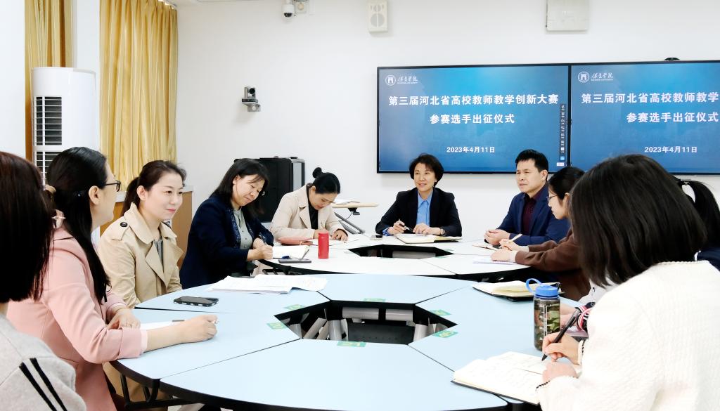 为鼓励我校教师在河北省高校教师教学创新大赛中取得优异成绩,进一步提升教师竞赛水平,4月11日,我校在教师育化中心举办第三届河北省高校教师教学创新大赛参赛选手出征仪式。党委常委、副校长马丽娟,校内指导专家,四位入围现场比赛的选手和教师发展指导中心全体人员参加仪式。