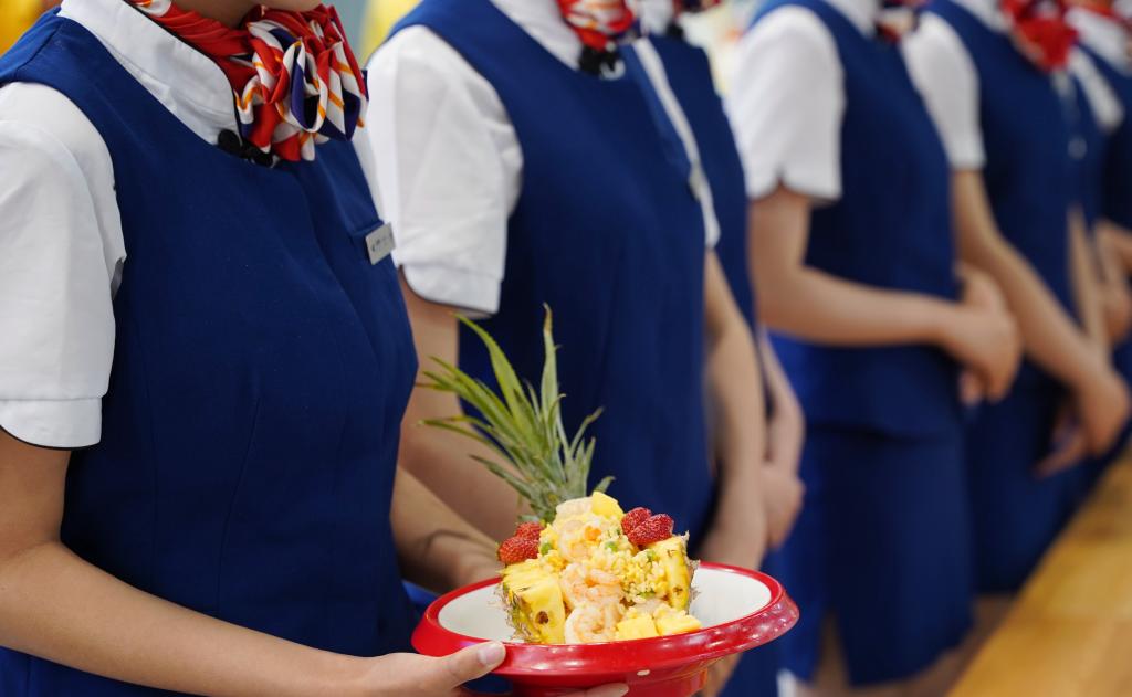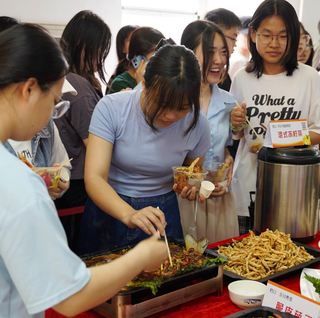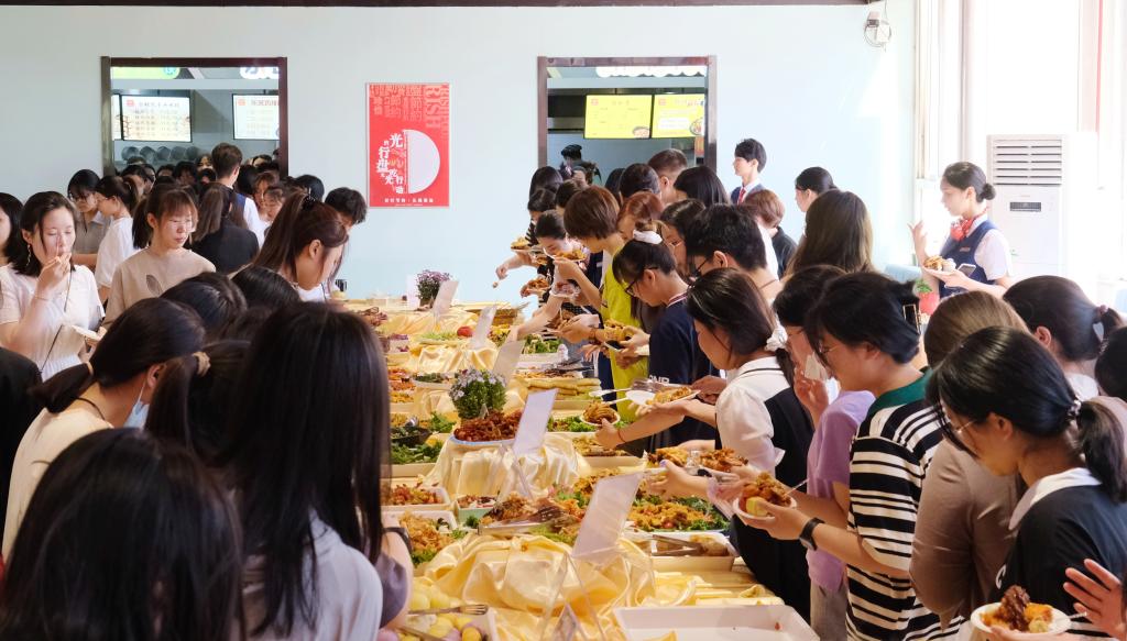 切下祝福的蛋糕,美食节正式拉开帷幕。校内三个餐厅准备了丰盛的特色美味供学生免费品尝。精湛的雕刻技艺、精巧的摆盘设计充分体现了美味与创意的融合,让学生们直呼过瘾。大家在尽情试吃后进行投票,评选出最喜欢的菜品。