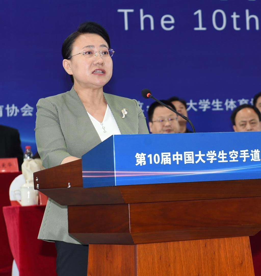 保定市人民政府副市长杨伟坤代表中共保定市委、保定市人民政府,向出席开幕式的领导、来宾和参赛队伍表示热烈欢迎。她指出,第10届中国大学生空手道锦标赛在保定举行,充分体现了中国空手道协会、中国大学生体育协会对保定竞技体育事业的支持与厚爱,必将把“奥运冠军之城”和“全国全民运动健身模范市”的金字招牌擦得更亮。希望大家能够因为空手道竞技与保定文化结缘,因体育精神与冠军之城携手,进一步增进了解、加深友谊,共享保定发展机遇、共创新时代体育发展美好未来。
