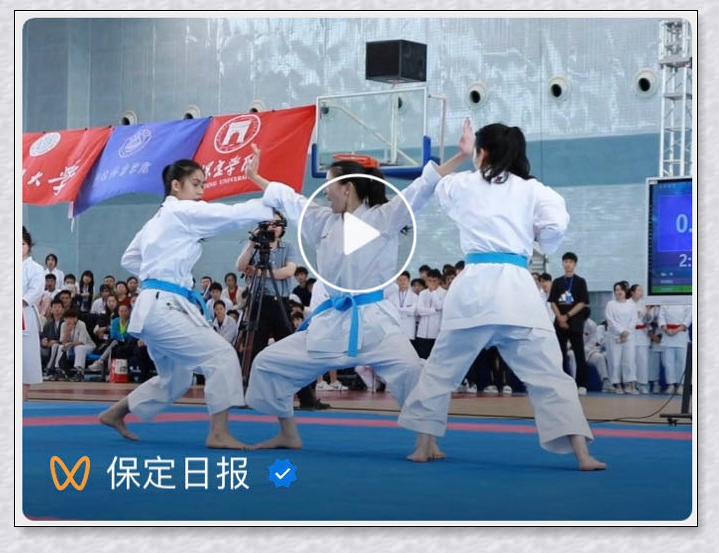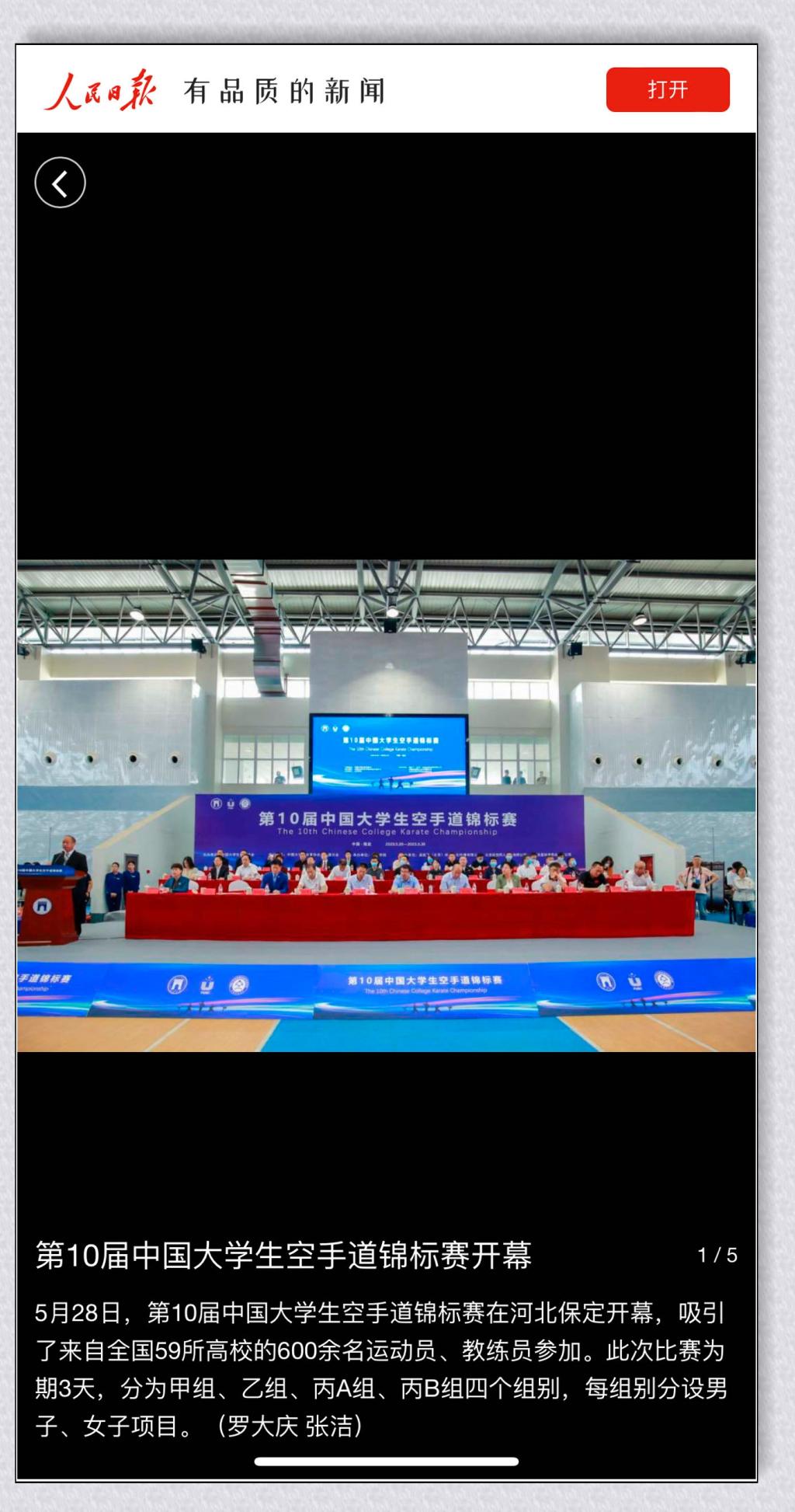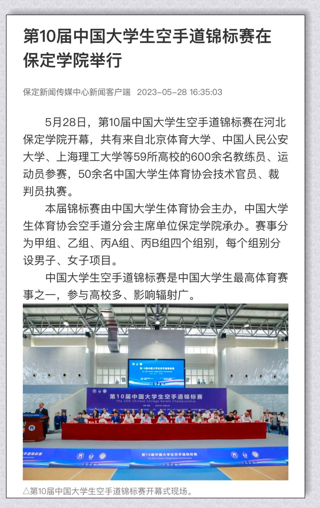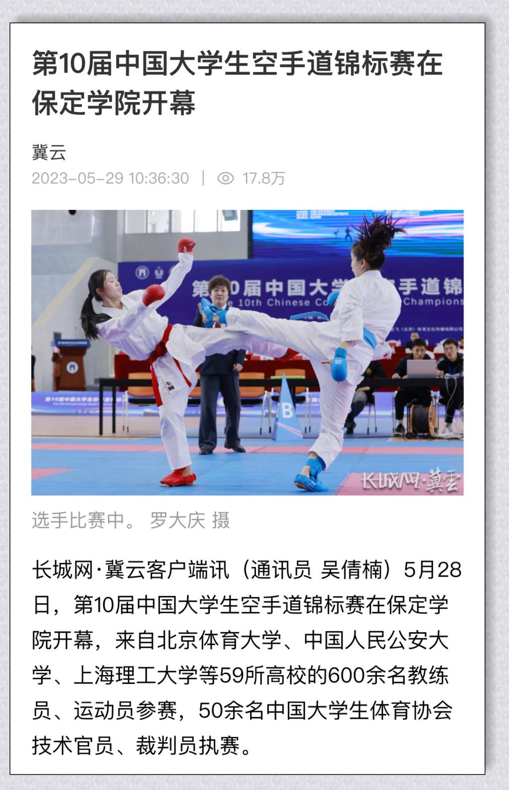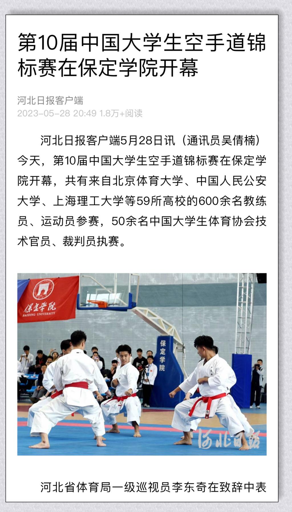 5月28日,第10届中国大学生空手道锦标赛在我校盛大开幕。赛事开始以来,人民日报客户端、人民网、冀云客户端、河北日报客户端、河北新闻网、保定日报、掌握保定客户端、在保定等多家主流媒体,纷纷以文字、图片、视频等形式聚焦本届体育盛会。