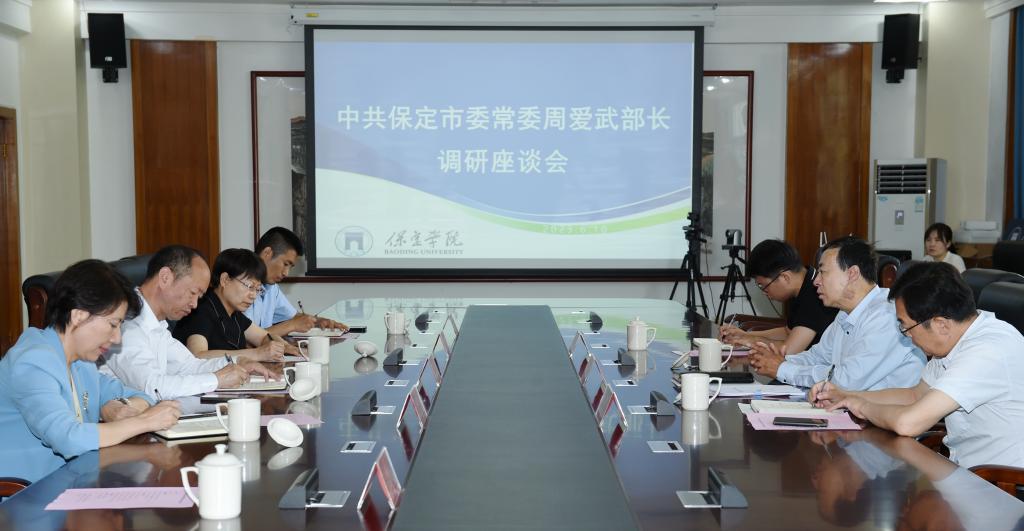 为深入贯彻中共保定市委十二届五次全会精神,6月10日上午,保定市委常委、统战部部长周爱武,保定市委统战部副部长、侨办主任卢建春一行来我校调研考察,在行政楼第五会议室召开调研座谈会。我校党委书记胡连利,党委副书记、校长韩会玲,党委常委、副校长马丽娟出席座谈会。韩会玲主持座谈会。
