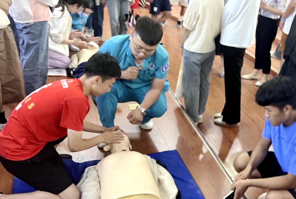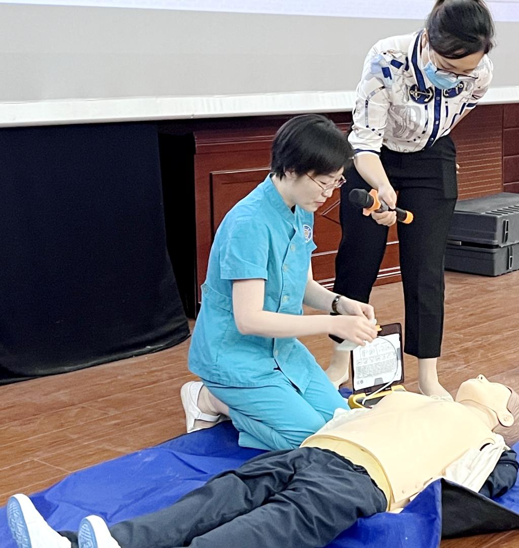 课上,保定市第一医院急诊科专家详细讲解了心脏骤停的判断方法、心肺复苏术的规范操作、海姆立克法的专业知识,并对相关急救技能进行示范,指导学生们现场演练。
