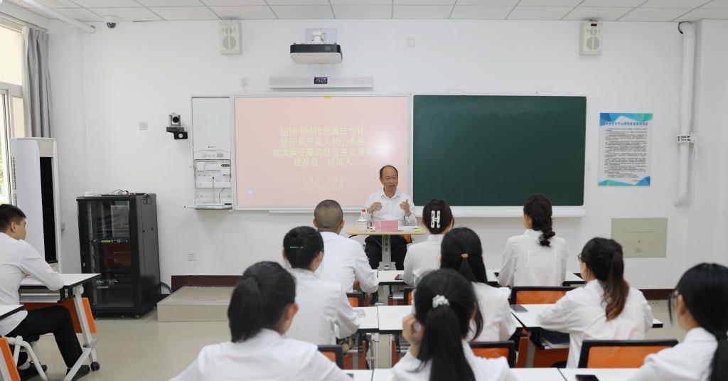 6月21日下午,党委书记胡连利以《弘扬中华传统廉洁文化 坚守共产党人初心本色 做崇廉守廉的社会主义事业建设者和接班人》为题,在教师育化中心多媒体教室为马克思主义学院学生党员、入党积极分子讲授专题廉政党课。