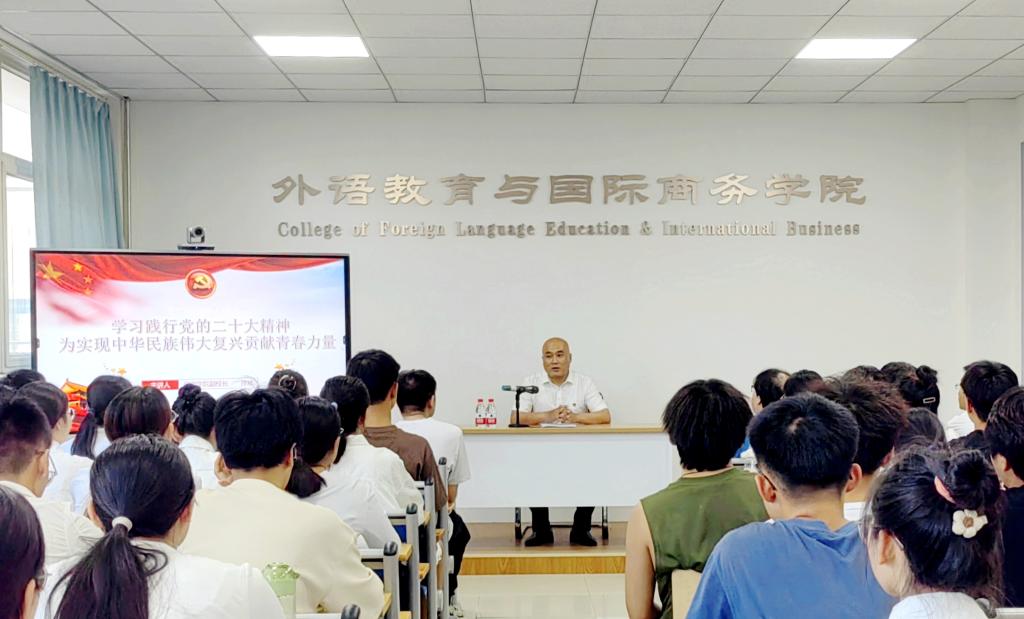 6月21日下午,党委常委、副校长孙斌以《学习践行党的二十大精神 为实现中华民族伟大复兴贡献青春力量》为题,为外语教育与国际商务学院、汽车与电子工程学院的学生党员、入党积极分子、学生干部讲授思政课。