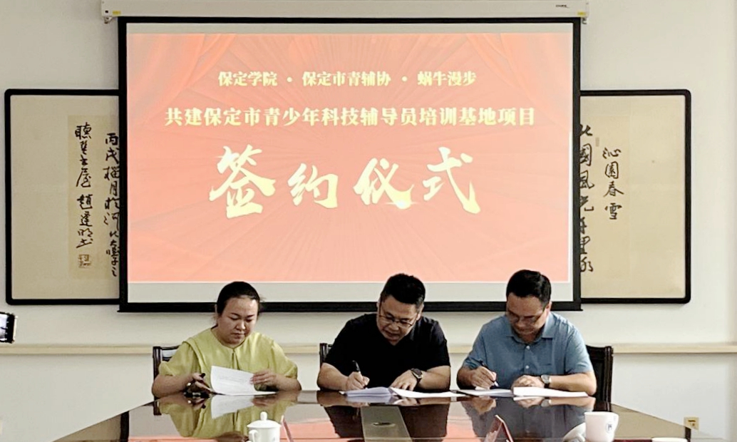 我校教务处、保定市青少年科技辅导员协会、保定蜗牛漫步教育科技有限公司负责同志共同签订共建协议。