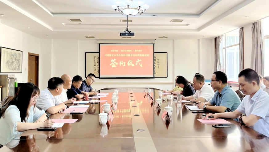 7月14日上午,我校与保定市青少年科技辅导员协会、保定蜗牛漫步教育科技有限公司在行政楼第三会议室举行共建保定市青少年科技辅导员培训基地签约仪式。党委常委、副校长孙斌,保定市科协副主席崔宏辰,保定市青少年科技辅导员协会理事长郭山,保定市科协学企部部长牛建哲,保定蜗牛漫步教育科技有限公司副总裁苏彤,我校教务处、人工智能学院、信息工程学院、教师教育学院负责同志参加仪式。