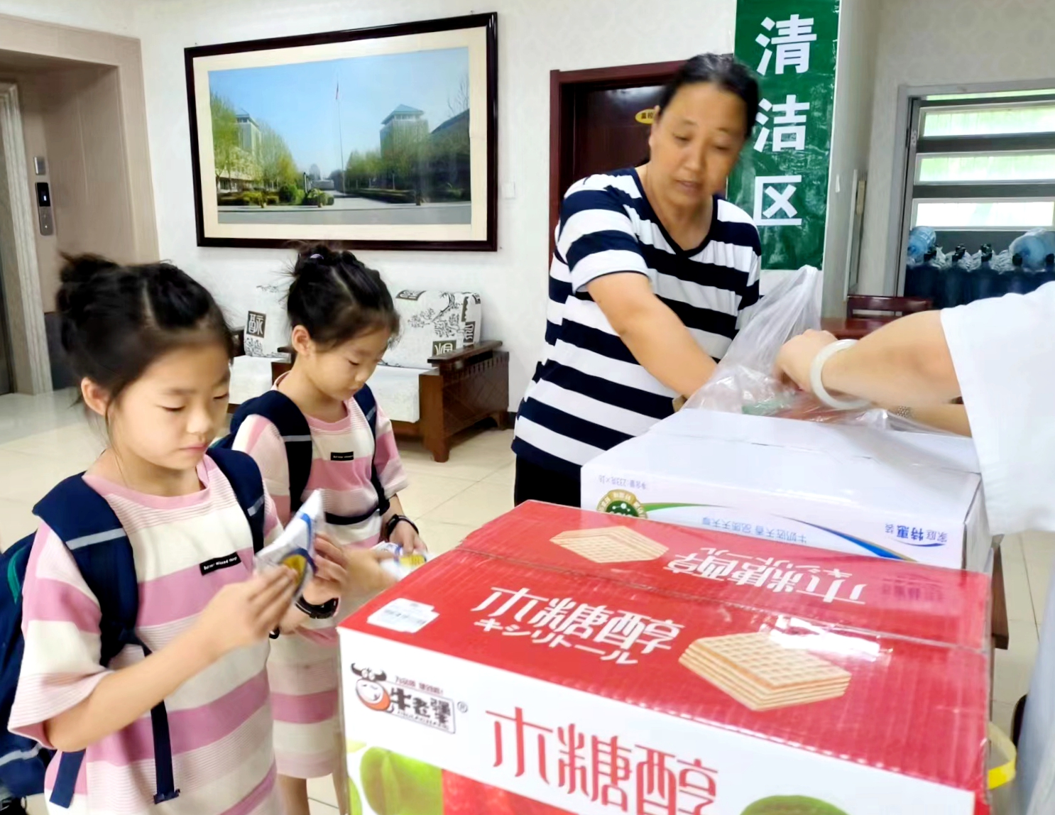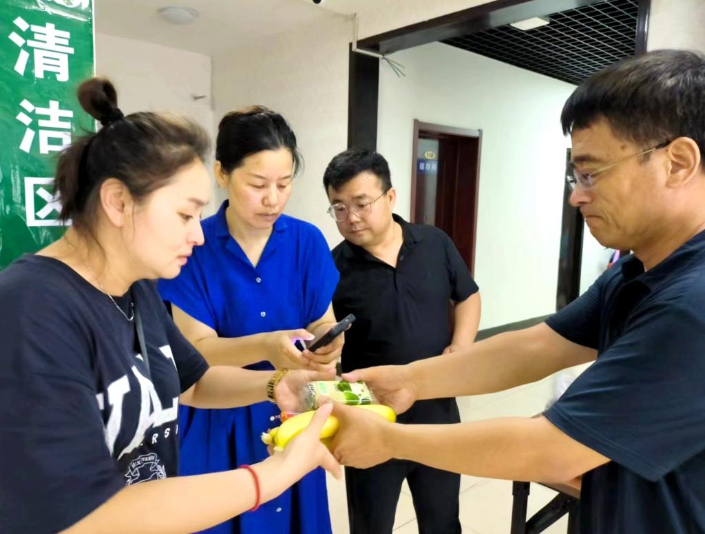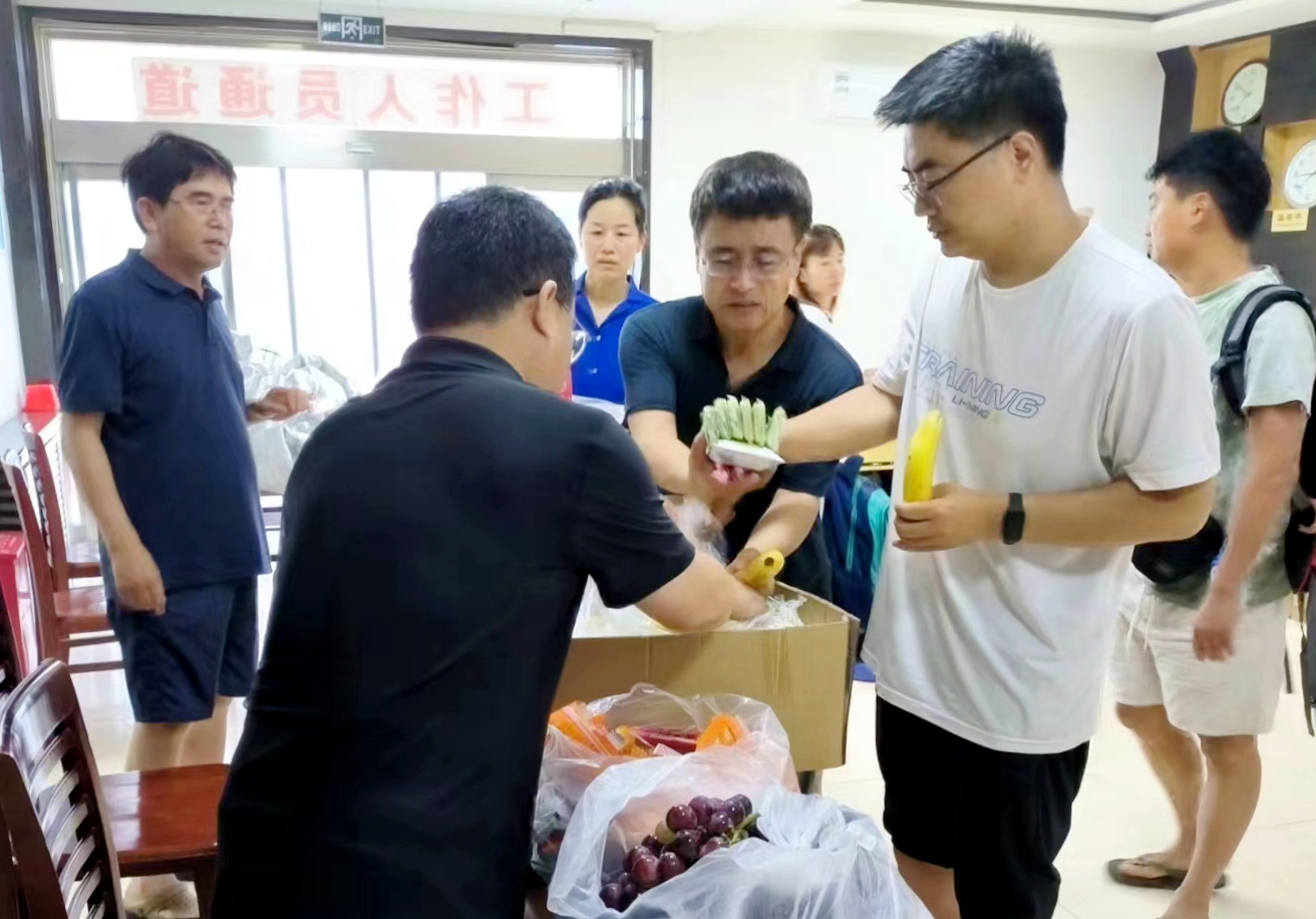 31日清晨,学校多方联系解决转移人员的早餐问题,但由于市内汛情严重,加之我校处于低洼深水地带,均无法及时送到学校。情急时刻,居住在学校附近小区的教职工闻讯后站了出来,李明老师在博仕园微信群发出消息:“东站转移了170人到咱们学校,我采购了340个鸡蛋,需要大家拿回家里煮,再送到学校,在家的老师们,请回复我,帮忙!”周俊红、孙建虎、王佳玲、龙吟、翟巧相、周秀芳等老师马上作出了回复响应,纷纷赶到小区超市与李明汇合。经过大家一起努力,李明、龙吟把先行采购好的牛奶、饼干、水果、火腿肠等餐品冒雨涉水送到学校国培公寓,及时赶到的齐卫东、杨新生、胡占宾、王伟光等一起为大家分发,解决了燃眉之急。