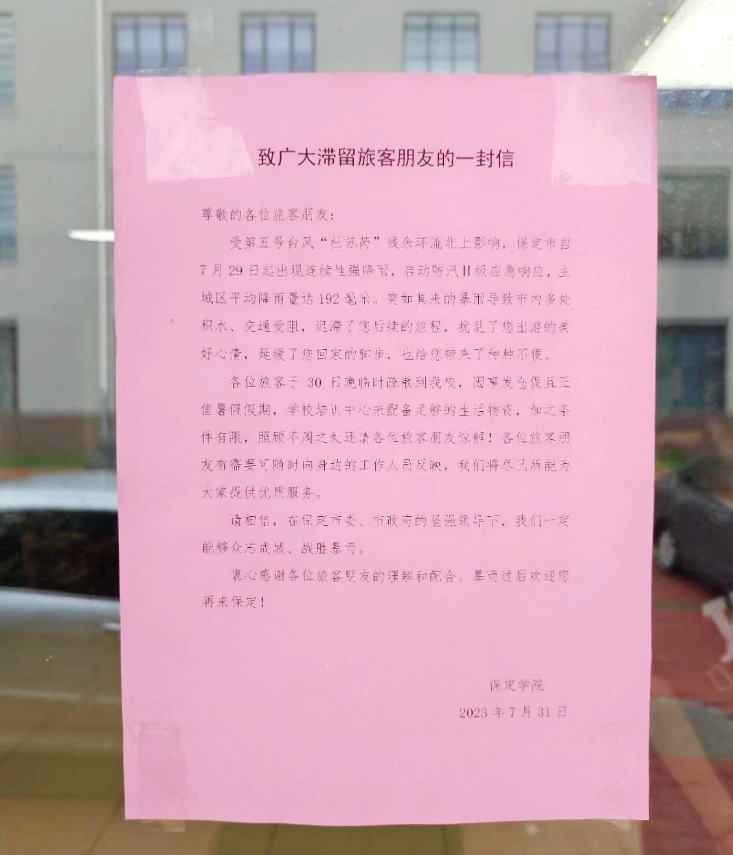 受台风“杜苏芮”影响,7月29日起,我市出现连续性强降雨,受此影响,保定东站区域严重积水导致车辆无法正常通行,造成大批旅客滞留。30日晚11时许,接到上级指令,我校作为紧急转运点,需要安置170名保定东站转移人员。汛情就是命令,保障就是责任。在校值守的后勤、保卫人员在做好校内抢修抢排的同时,立即集合起来,清理校内道路,整理所需房间,在31日凌晨1点前,将200个床位准备完毕,迎接170位转移人员入住。