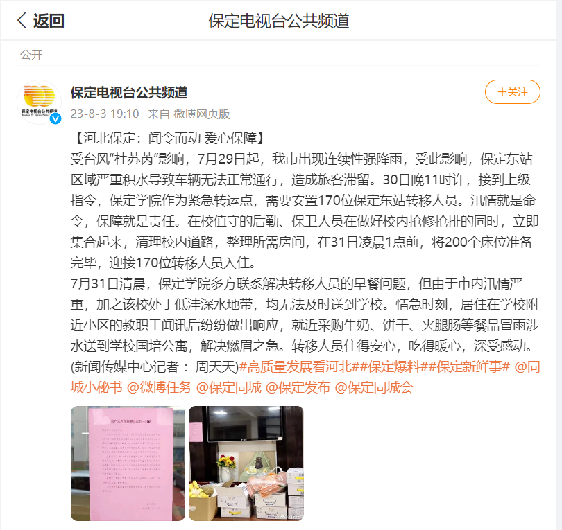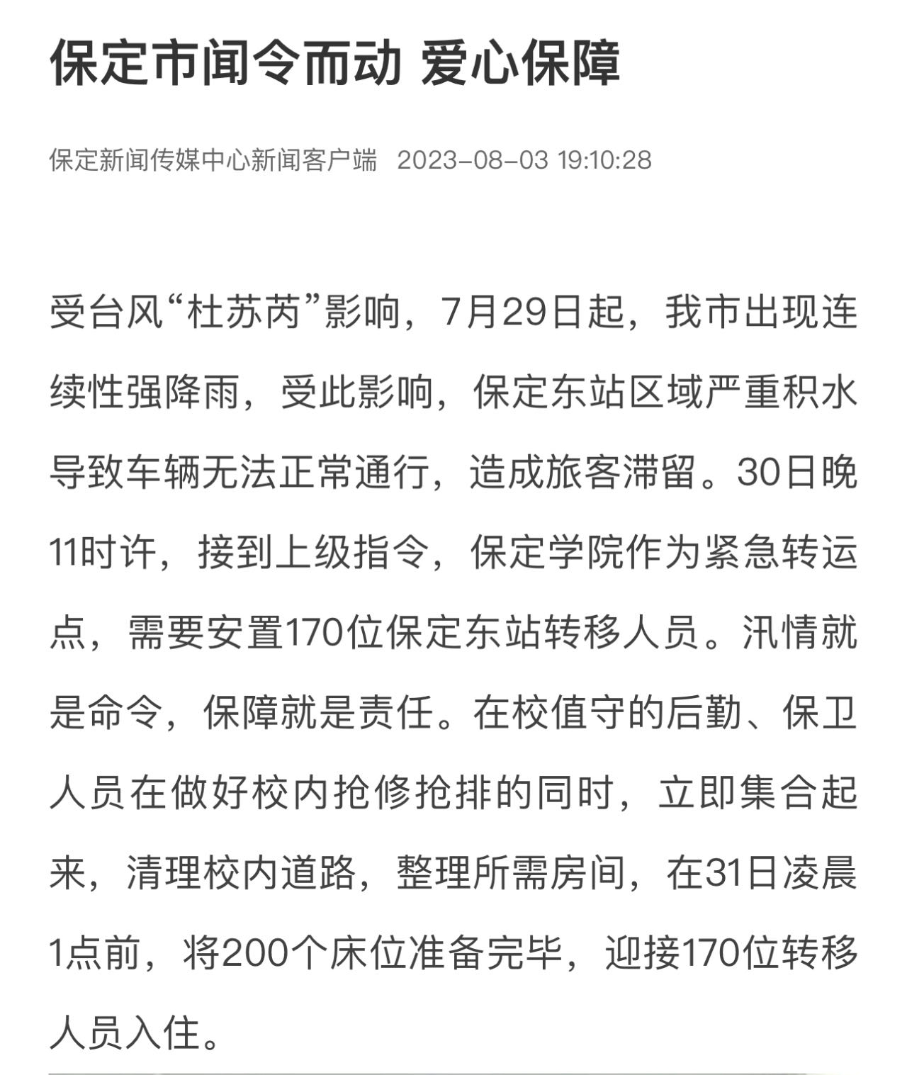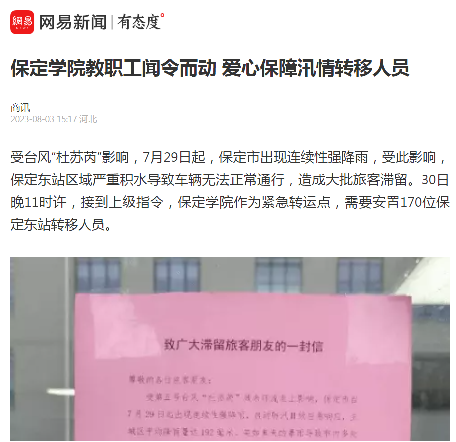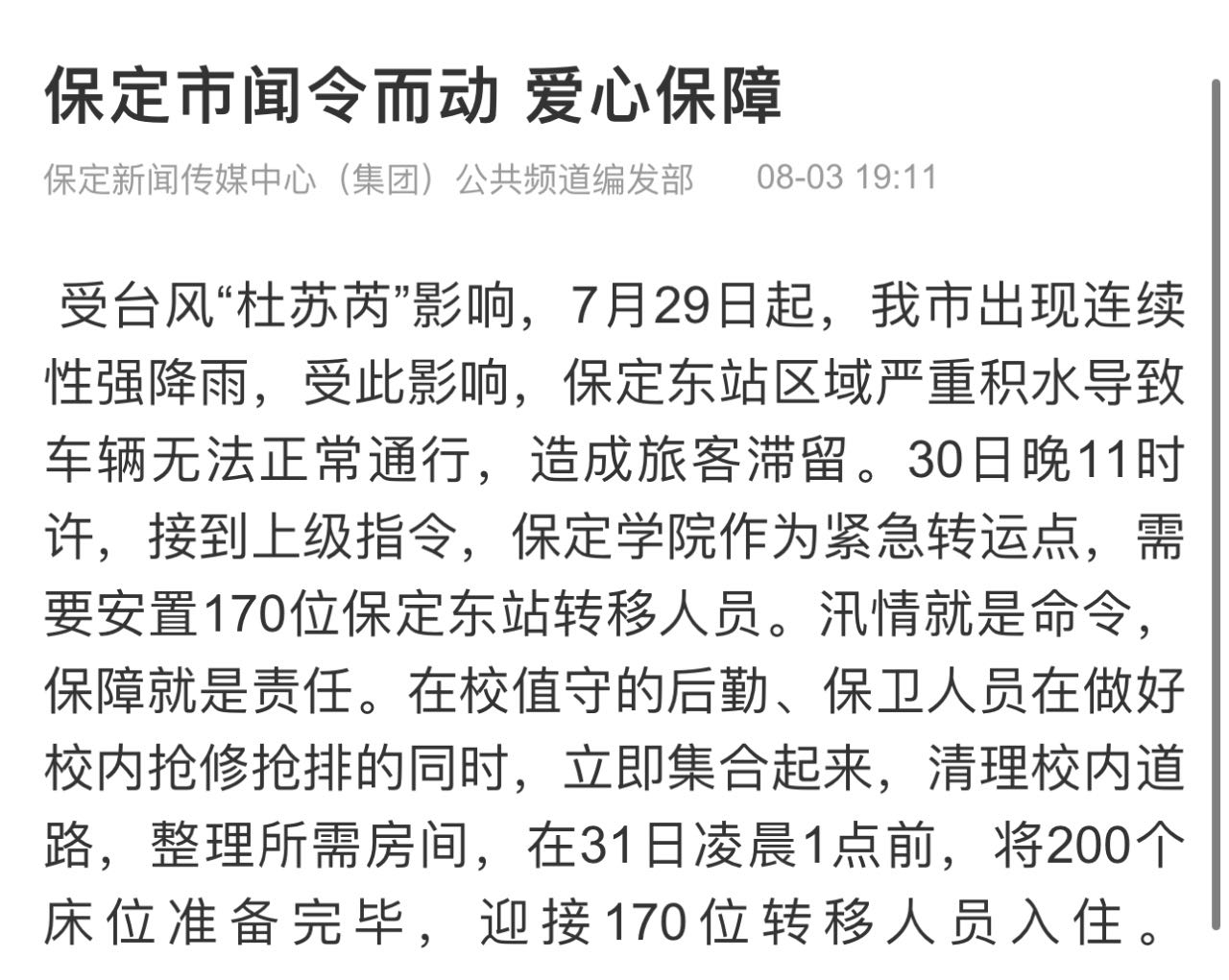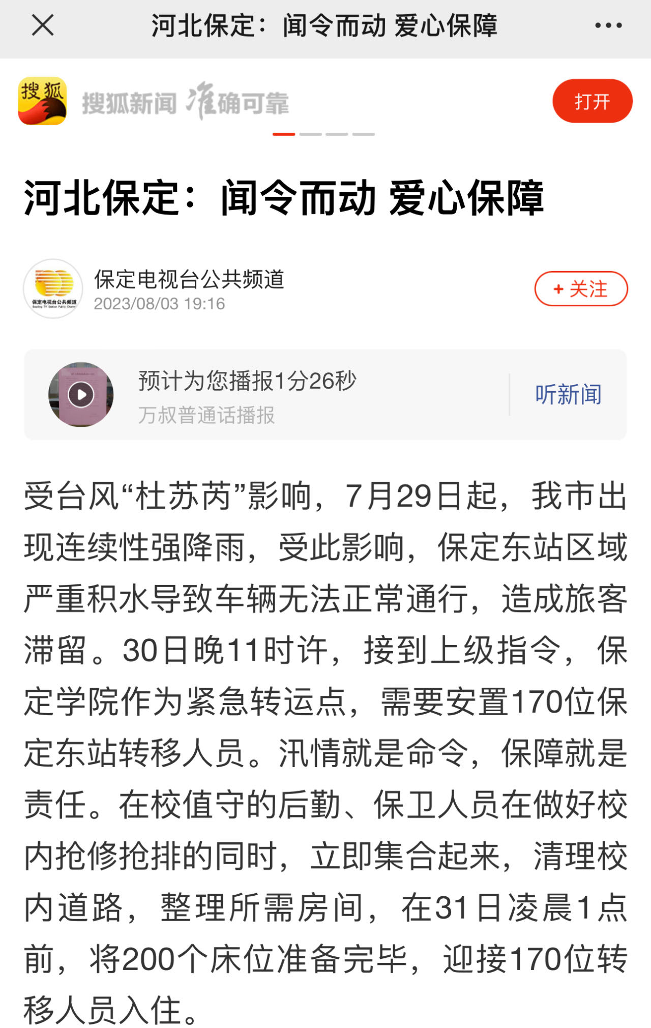 8月3日,《我校教职工闻令而动 爱心保障汛情转移人员》在保定学院官方网站、微信公众平台发布后,网易、人民日报客户端、搜狐、今日头条、保定电视台公共频道微博、保定新闻传媒中心新闻客户端、“在保定”客户端等多家媒体纷纷予以关注,相继进行了报道和转载。