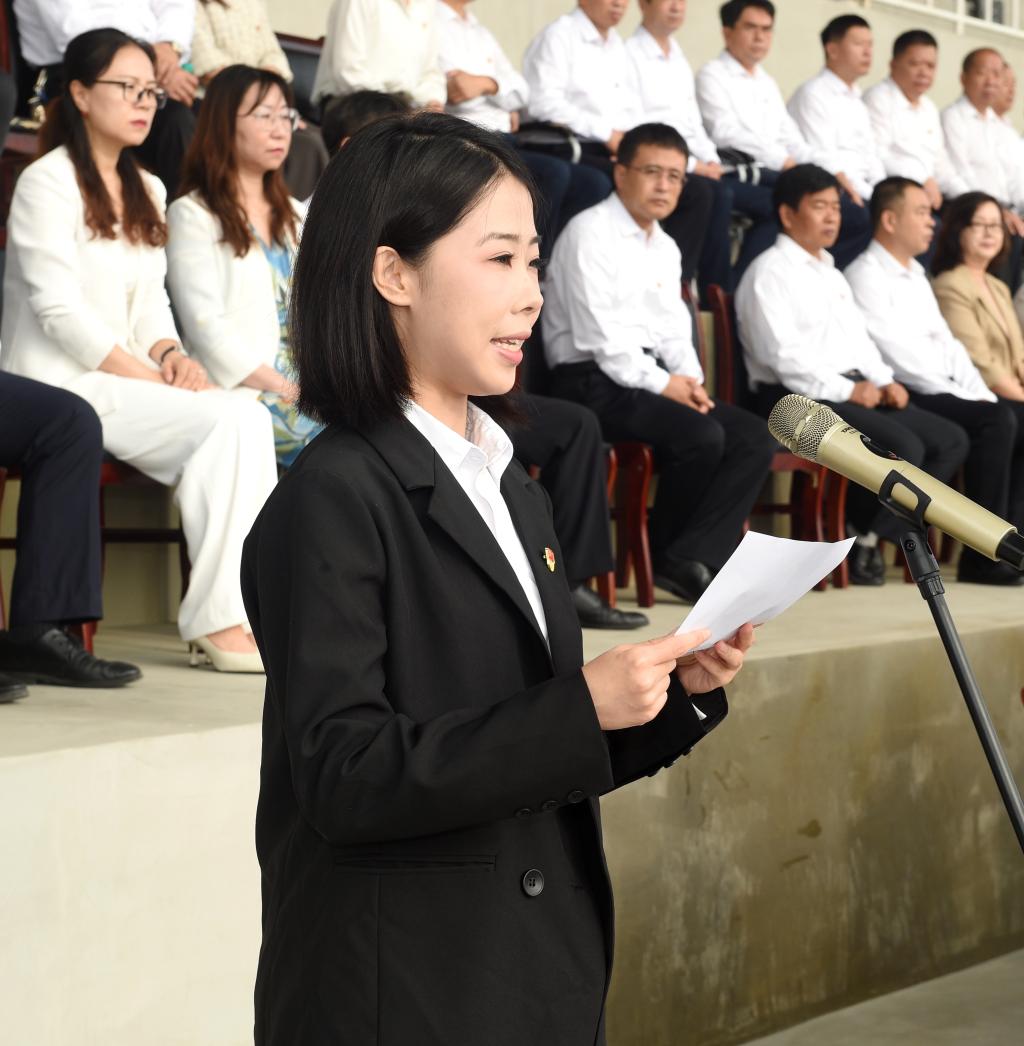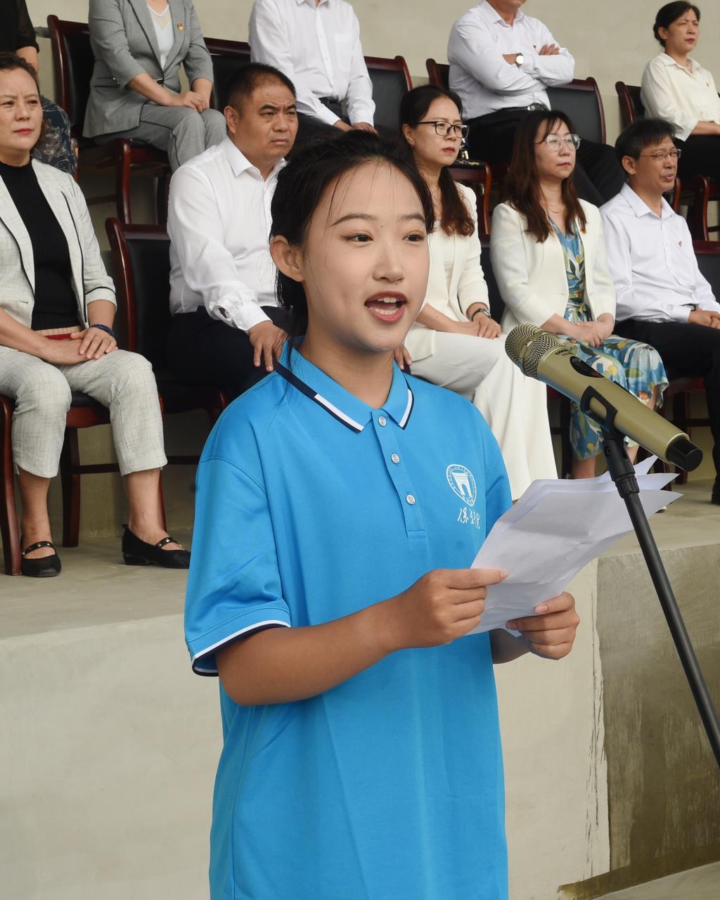 教师代表、外语教育与国际商务学院院长张广天,在校生代表、美术与设计学院李欣依霖,新生代表、地理与旅游学院孙熙艾,军训教官代表尹萌分别在典礼上发言。