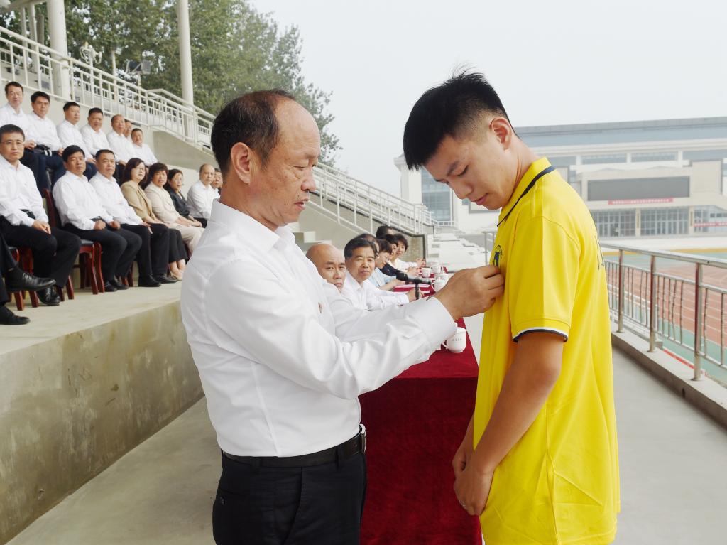 党委书记胡连利为新生代表佩戴保定学院校徽,为15个军训团授旗。