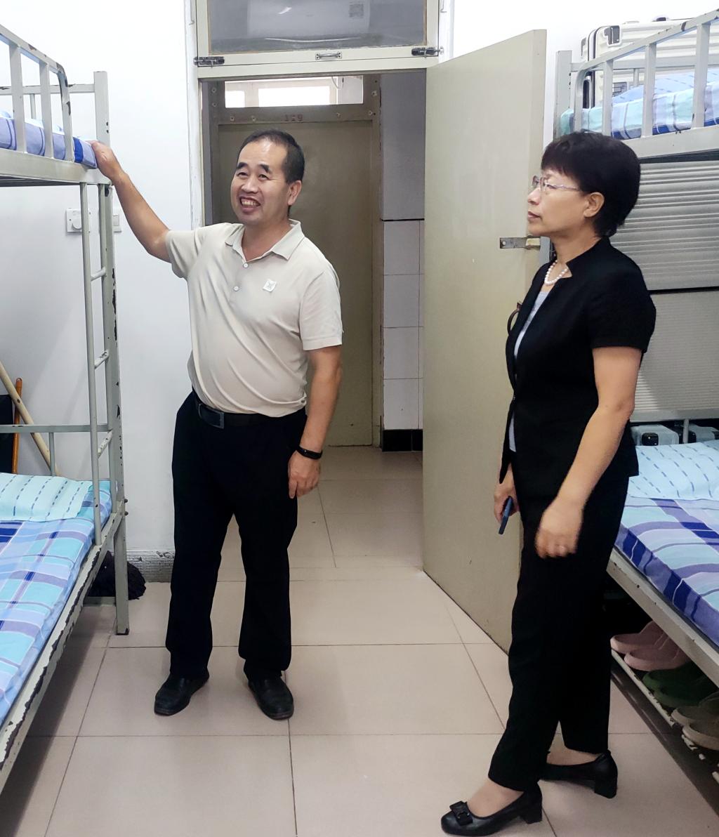 9月12日上午,党委副书记、校长韩会玲在学生处负责人的陪同下,到学生宿舍检查指导2023级新生军训内务工作。