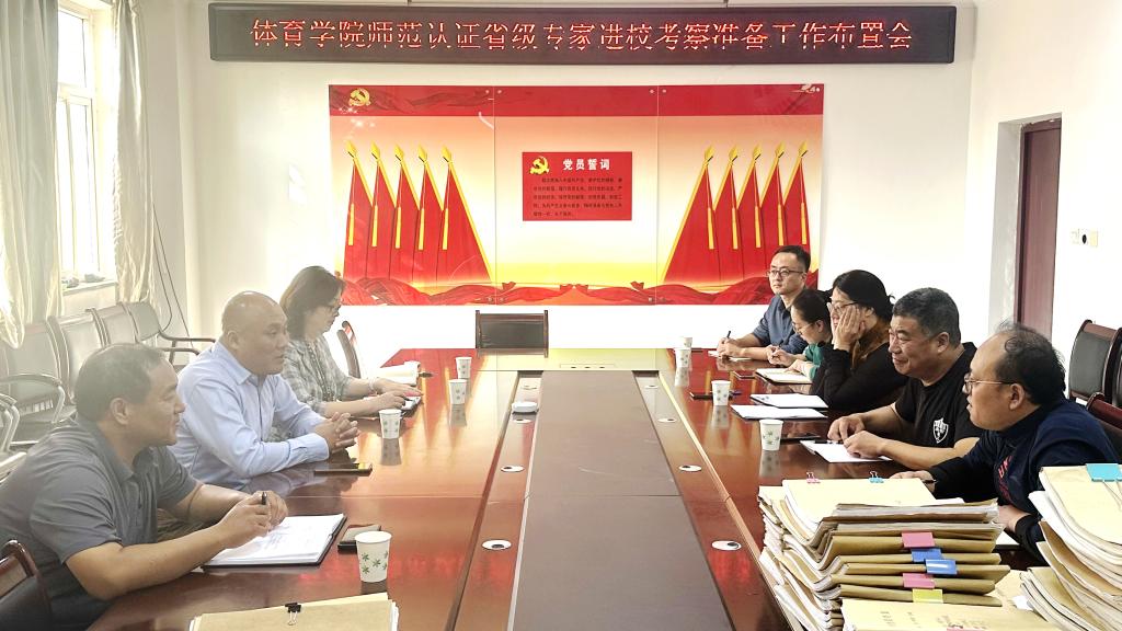 在听取了体育学院负责人关于体育教育专业迎接专家组进校考查相关准备工作的汇报后,孙斌强调,师范类专业认证是我校专业建设工作的重要组成部分,此次省级师范类专业认证专家组进校考查是对我校师范类专业办学质量的一次全面检验,要高度重视,加强责任落实;认真凝练专业特色,完善各种材料,做好各类人员的培训,将相关工作任务落实到人,团结协作,确保顺利达成专业认证目标。