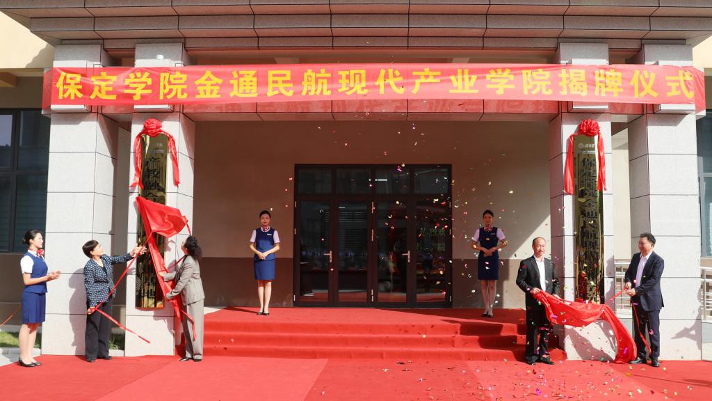 胡连利、韩会玲、焦殿成、刘旭共同为“保定学院金通民航现代产业学院”揭牌。