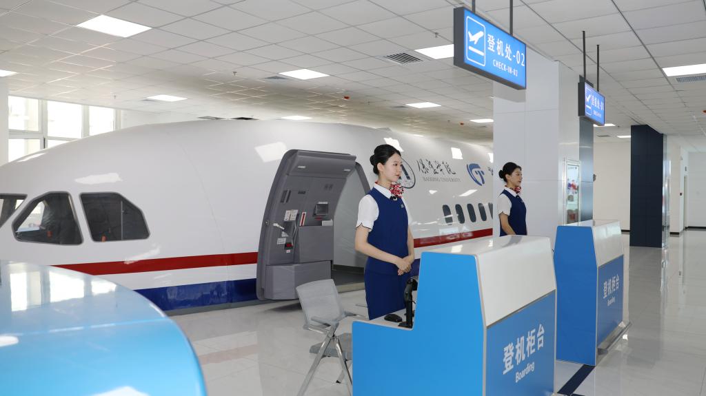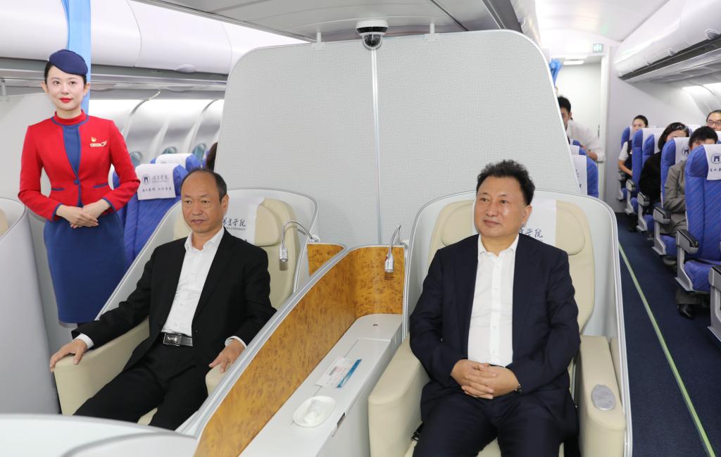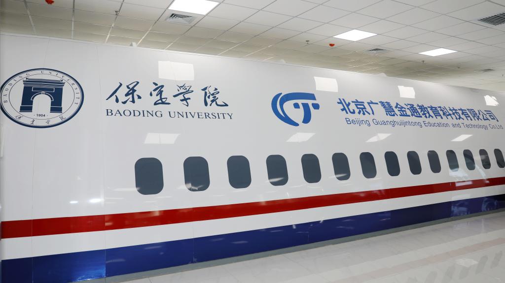 “您好,欢迎乘机!”在“乘务员”的引导下,“乘客”们有序进入“飞机客舱”,开启沉浸式体验……10月18日上午,保定学院金通民航现代产业学院揭牌仪式在我校现代实训中心举行,被称为“保定学院号专机”的A330双通道客舱模拟器正式投入使用。
