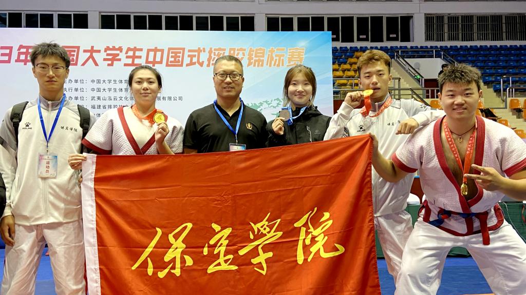 日前,2023年中国大学生中国式摔跤锦标赛在福建省武夷山泓云体育训练基地举行,来自全国45所高校的近400名运动员同台角力、一“跤”高下。由体育学院5名学生组成的我校代表队,经过激烈角逐,荣获3金1银1个第五名。其中,王博获得男子甲B组82公斤级冠军,张劲松获得男子甲B组60公斤级冠军,胡佳慧获得女子甲B组82公斤级冠军,李柏萱获得女子甲B组60公斤级亚军,王旭获得男子甲B组65公斤级第五名。