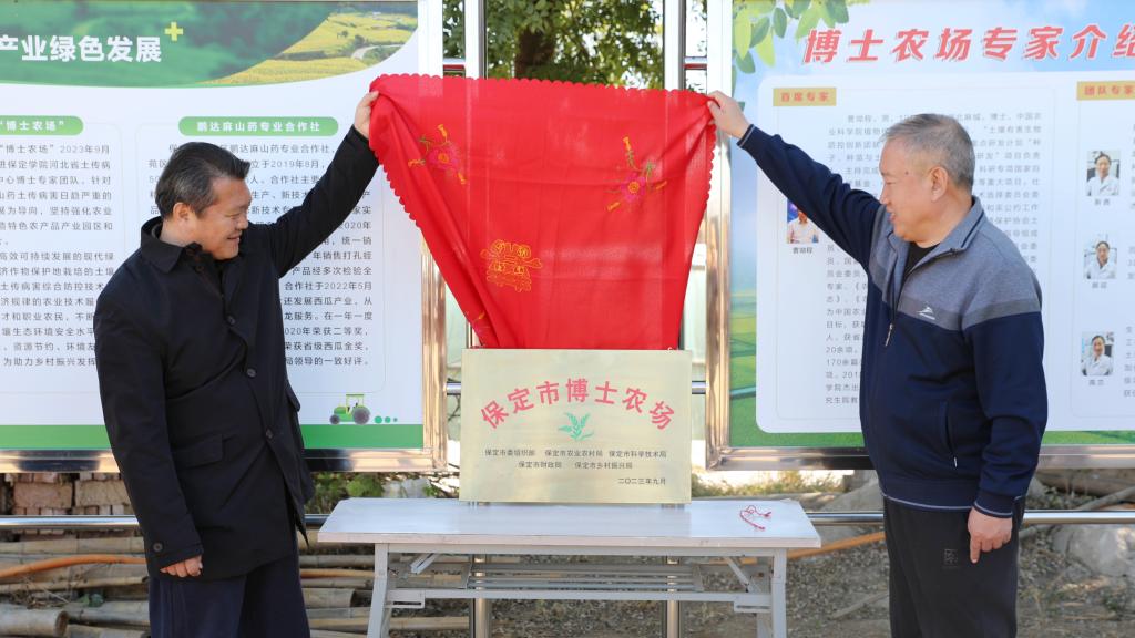 赵其国、樊建民共同为我校支持建设的“保定市博士农场”揭牌。