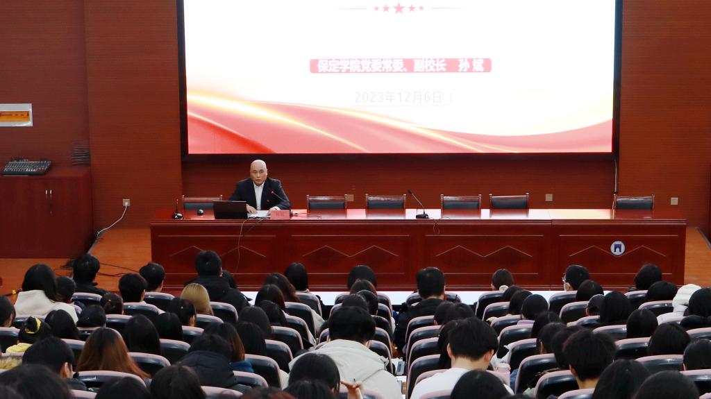12月6日下午,党委常委、副校长孙斌在昌绪学术厅以《做一名信仰坚定 品质优秀 本领过硬的新时代大学生》为题,为外语教育与国际商务学院、汽车与电子工程学院学生讲授思政课。