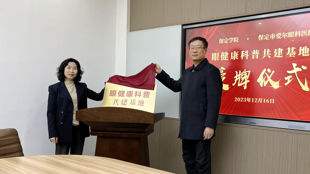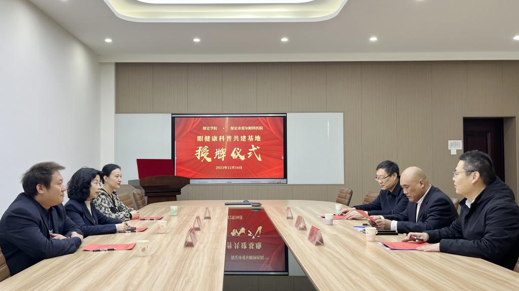 12月16日,我校与保定爱尔眼科医院眼健康科普共建基地授牌仪式在行政楼举行。我校党委常委、副校长孙斌,保定爱尔眼科医院CEO王欣、屈光手术科主任李佳佳、健康教育服务部主任顾镭,我校教务处、校医院负责同志参加仪式。