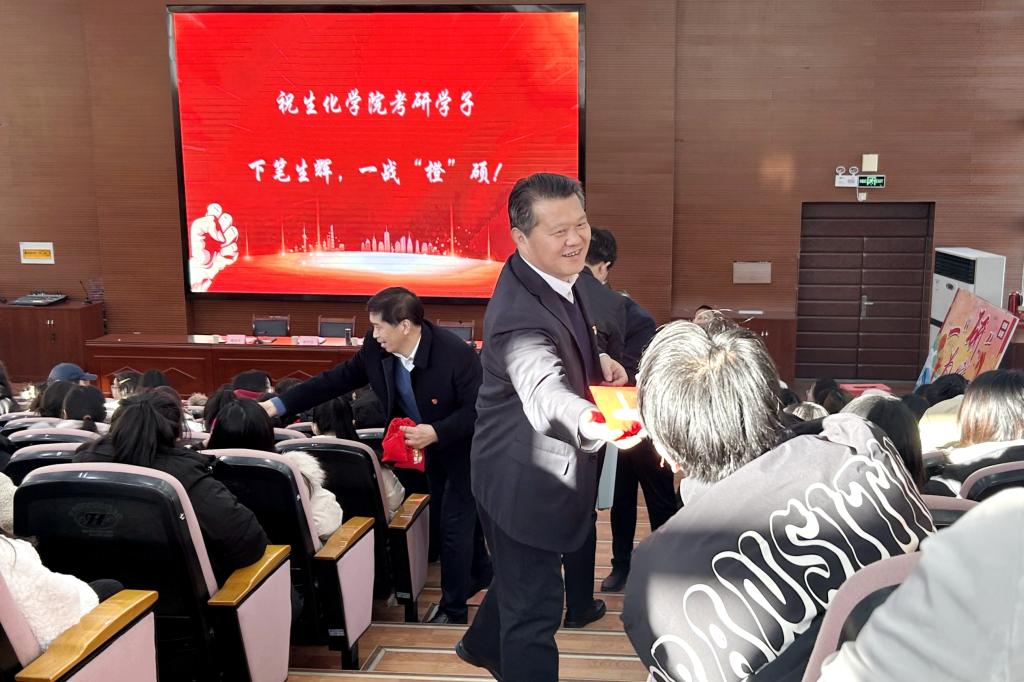 12月21日下午,受党委书记胡连利委托,党委常委、副校长赵其国来到生物化工与环境工程学院考研出征仪式活动现场,为即将踏上考场的学子们送上鼓励和祝福,希望大家让最热烈的情绪与最寒冷的时节碰撞产生最激烈的化学反应,创造出最优异的成绩;祝福全校考研学子笔下生辉,一战成硕。