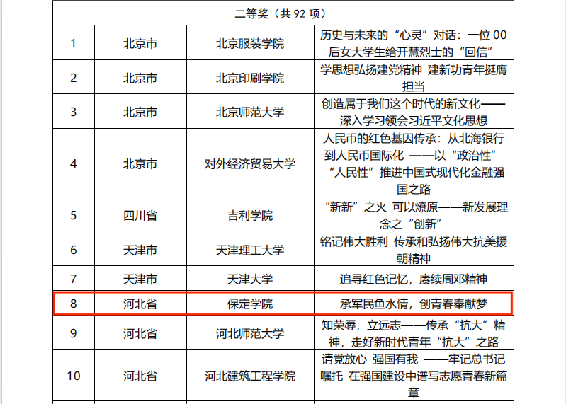 全国高校大学生讲思政课公开课展示活动是教育部组织开展的习近平新时代中国特色社会主义思想大学习领航计划系列主题活动之一。在本次大赛中,河北省共有3个本科高校作品获二等奖、1个本科高校作品获三等奖。