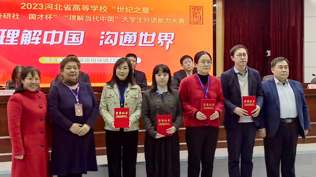 在系列赛事中,外语教育与国际商务学院教师王丹娜、李旭炜、祃石磊、董蕾、肖莉艳团队荣获第九届河北省高等学校外语金课大赛本科英语组一等奖,关晨、张利明、付慧君团队荣获河北省高校外语微课大赛二等奖,王丹、刘鑫、赵亚男荣获河北省高校外语教学大赛三等奖。外语教育与国际商务学院学生张文卓(指导教师:张璐)荣获河北省高校“世纪之星”大学生外语能力大赛多语种组金奖,将代表河北省参加“外研社·国才杯”“理解当代中国”大学生外语能力大赛国赛。外语教育与国际商务学院学生单艺(指导教师:赵翠玲)、信息工程学院学生何骐鹏(指导教师:马伟莲)荣获河北省高校“世纪之星”外语演讲大赛银奖,信息工程学院学生李伊寒(指导教师:赵楠)获该赛事铜奖。马克思主义学院学生徐家华、申靓(指导教师:王慧剑、刘艳)、外语教育与国际商务学院学生魏祎璠(指导教师:陈静)荣获河北省高校“世纪之星”英语写作比赛铜奖。外语教育与国际商务学院学生暴乐炜(指导教师:韩杰)、教师教育学院学生杨佳慧(指导教师:付慧君)荣获河北省高校“世纪之星”英语阅读比赛铜奖。马克思主义学院学生吴浩越(指导教师:付慧君)、外语教育与国际商务学院学生周金灿(指导教师:高山)荣获河北省高校“世纪之星”英语组笔译赛项铜奖。外语教育与国际商务学院学生杨怡然(指导教师:张莹莹)荣获河北省高校“世纪之星”英语组口译赛项铜奖。