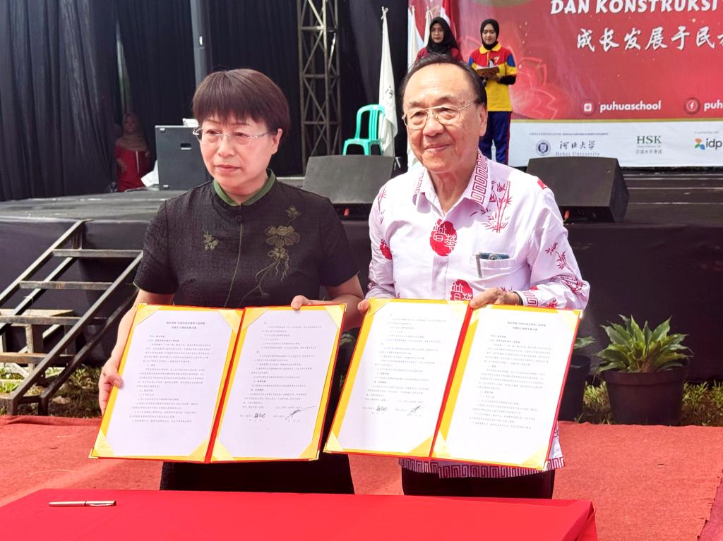 普华三语学校是印度尼西亚教育部正式批准成立的全日制国际学校,包含从幼儿园到高中的所有学段。在普华三语学校访问期间,韩会玲与该校主席陈友明签订了共建孔子课堂实施方案,就办公和教学设备保障、师资配备、学生培养及来华留学等事宜作了详细探讨,查看了开办孔子课堂的办公、教学设施和孔子课堂专用场地施工设计方案,看望了正在该校进行教学实践的我校文学院学生。